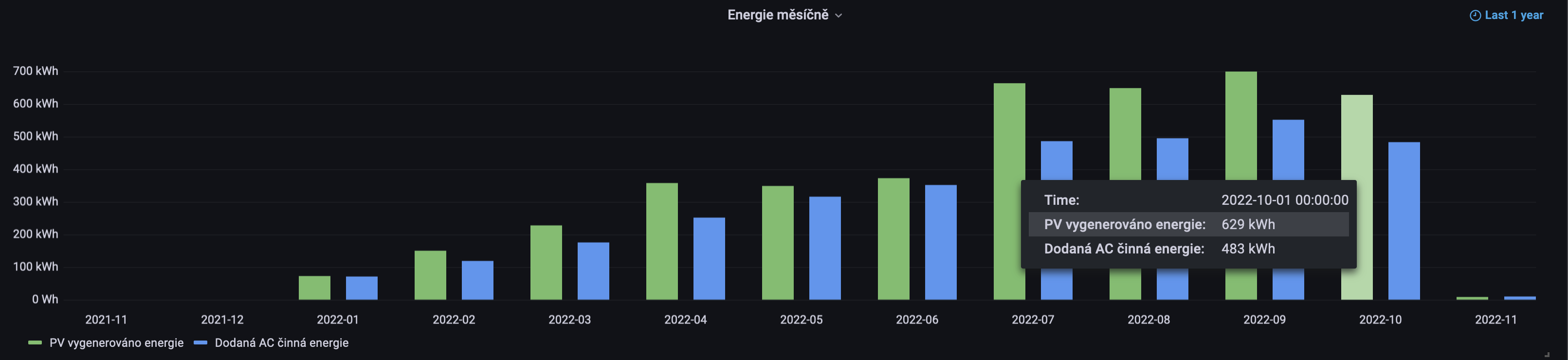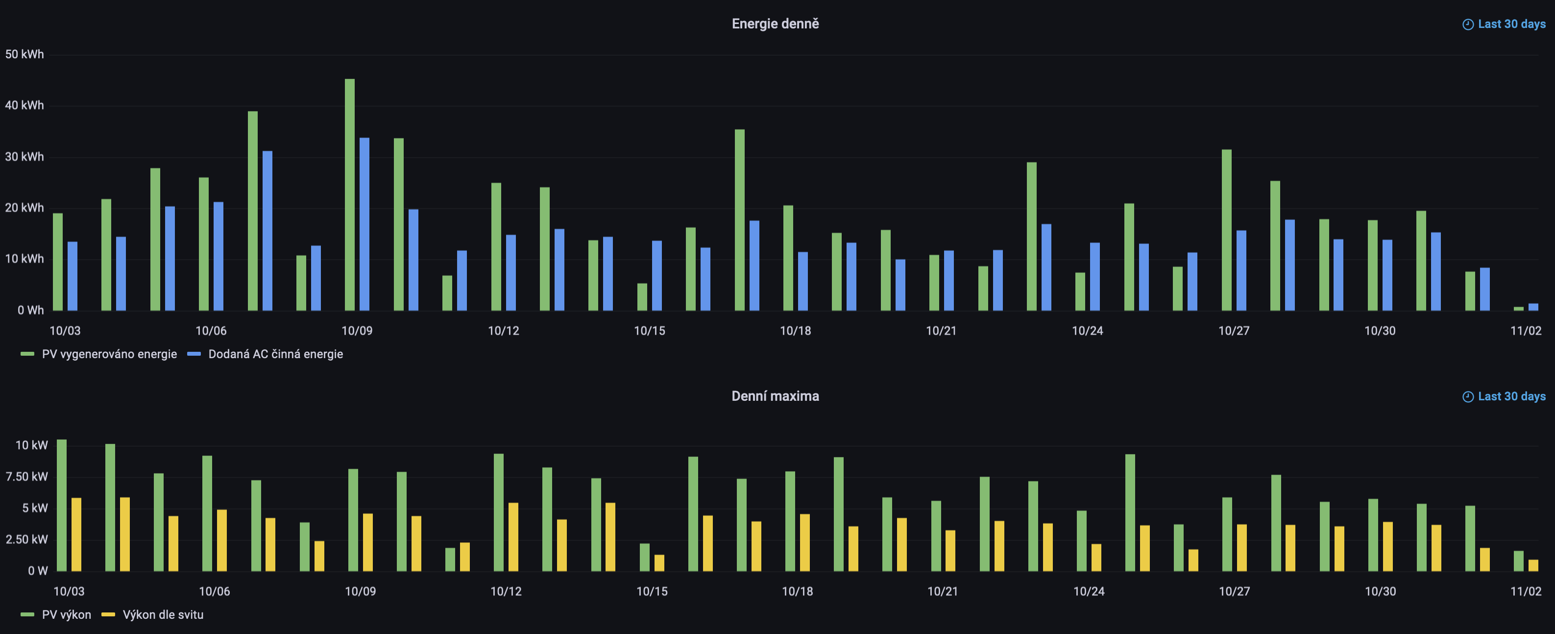 Denní maximum energie na PV straně 45.3 kWh jsem vygeneroval 9. října, čemuž odpovídalo také maximum spotřeby na AC střaně ve výši 33.8 kWh. Nejhorší den s nejmohutnější oblačnosti jsem pozoroval pouze 5.28 kWh na PV straně 15. října. Podobně jako v září, také v říjnu byla řada dní, kdy jsem schopen generovat aktuální výkon přes 10 kW na PV straně (z instalovaných 8.56 kWp). Zvolené bifaciální half-cut monokrystalické panely hodnotím jako velmi dobré. Pozoruji, že i při menší a střední oblačnosti panely generují mnohem více než odpovídá deklarované jednostranné účinnosti 21%. Vzhledem k pyrometrickému měření záření to vypadá, že účinnost přeměny záření na elektrickou energii směrem k nižším hodnotám záření nejdříve stoupá a při velmi malém záření začne pak účinnost rychle padat zpět.