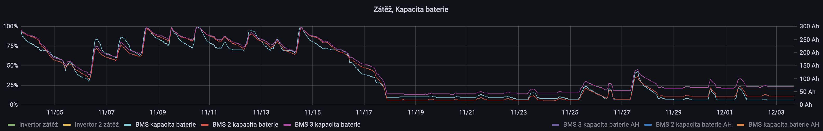 Následující graf ukazuje SoC baterií v průběhu posledních 30-ti dnů. Přepnutí na DS provádím, když poklesne napětí na libovolném článku ve všech bateriích na 3.0 V. Na grafu SoC je vidět, že výpočet aktuálního nabití baterie na 200A JK BMS je z dlouhodobého času velmi nepřesné a driftuje směrem nahoru (fialová křivka). Vypadá to, že jeho měření proudových toků při nižších proudech je velmi nepřesné a při nabíjení připočítává více než při vybíjení. Z toho důvodu pak na delším času dochází k posunu akumulovaného AH směrem nahoru i když to není pravda. Předpokládaný stav nabití beterie se na tomto JK BMS zase sám zkalibruje při úplném dobití baterie. AntBMS je z toho pohledu velmi stabilní a měří dobře (nebo alespoň se stejnou chybou) v celém proudovém rozsahu. Nevadí mi, že vybíjím baterie na zhruba 10-15% jejich SoC. Baterie nejsou na takovém stavu nabití udržovány dlouhodobě a i přes pokročilou roční dobu jsou dny, kdy se baterie celkem slušne dobíjí.