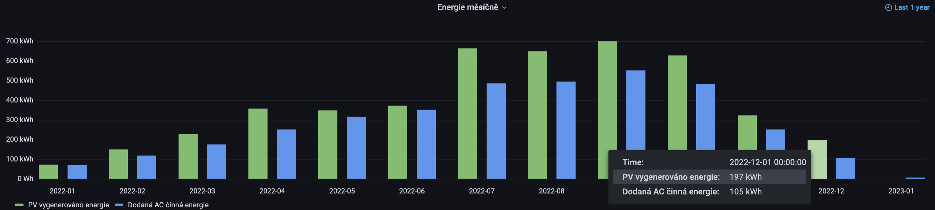 V prosinci pokračoval střídavý provoz na FVE a na DS. Celkově se dům provozoval 24% času na ostrovní FVE, zbylých 76% času jel na DS (většinou v noci). Za tento měsíc jsem vygeneroval 197 kWh na PV straně s dodanou činnou lokálně spotřebovanou enerií na AC straně 105 kWh (zde je již odečtena vlastní spotřeba FVE ze vstupu DS jak je popsáno dále). Tento měsíc se také pořádně ochladilo a bylo potřeba začít topit tepelným čerpadlem. Z DS jsem tak tento měsíc celkem odebral 1162 kWh.