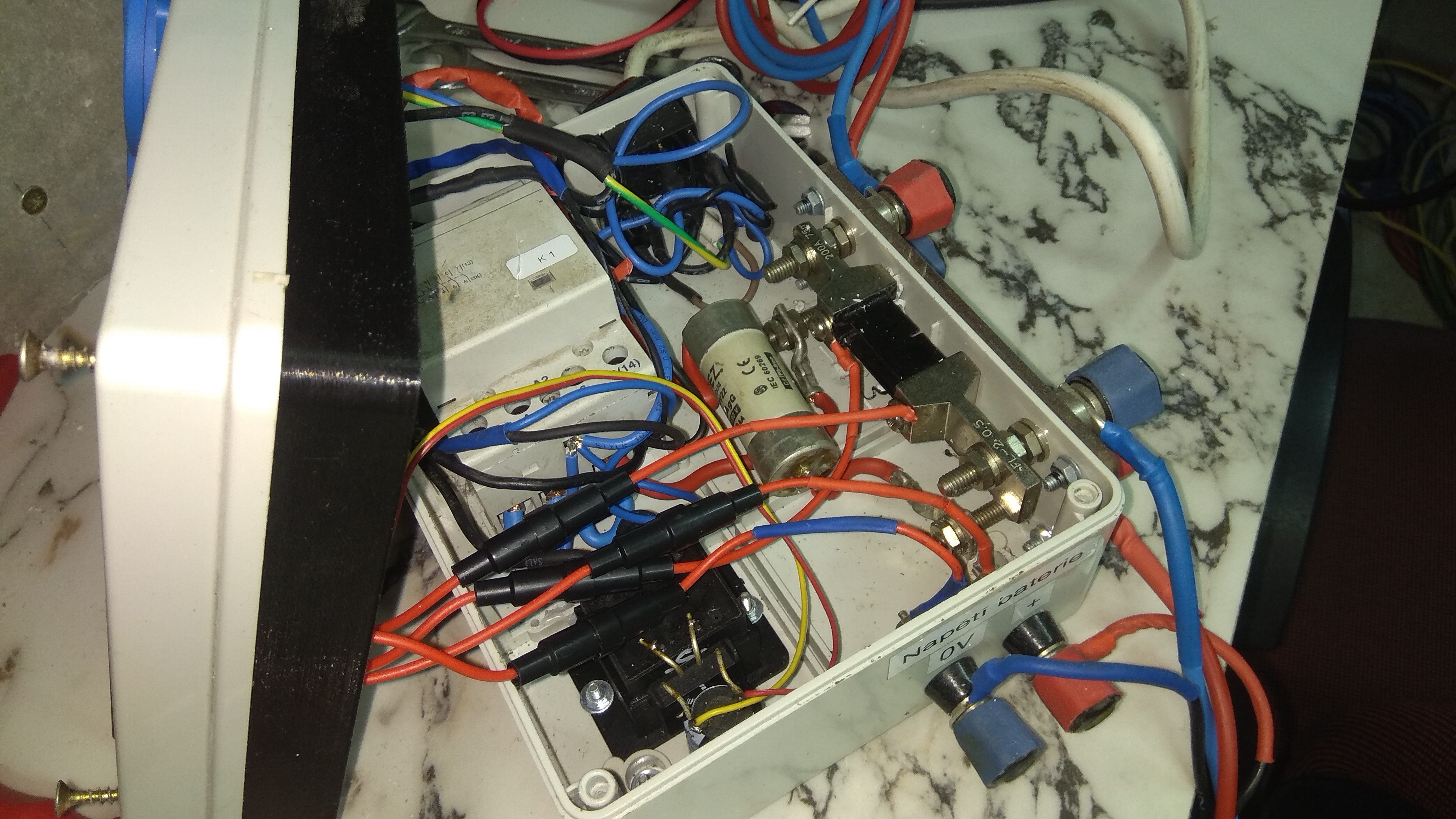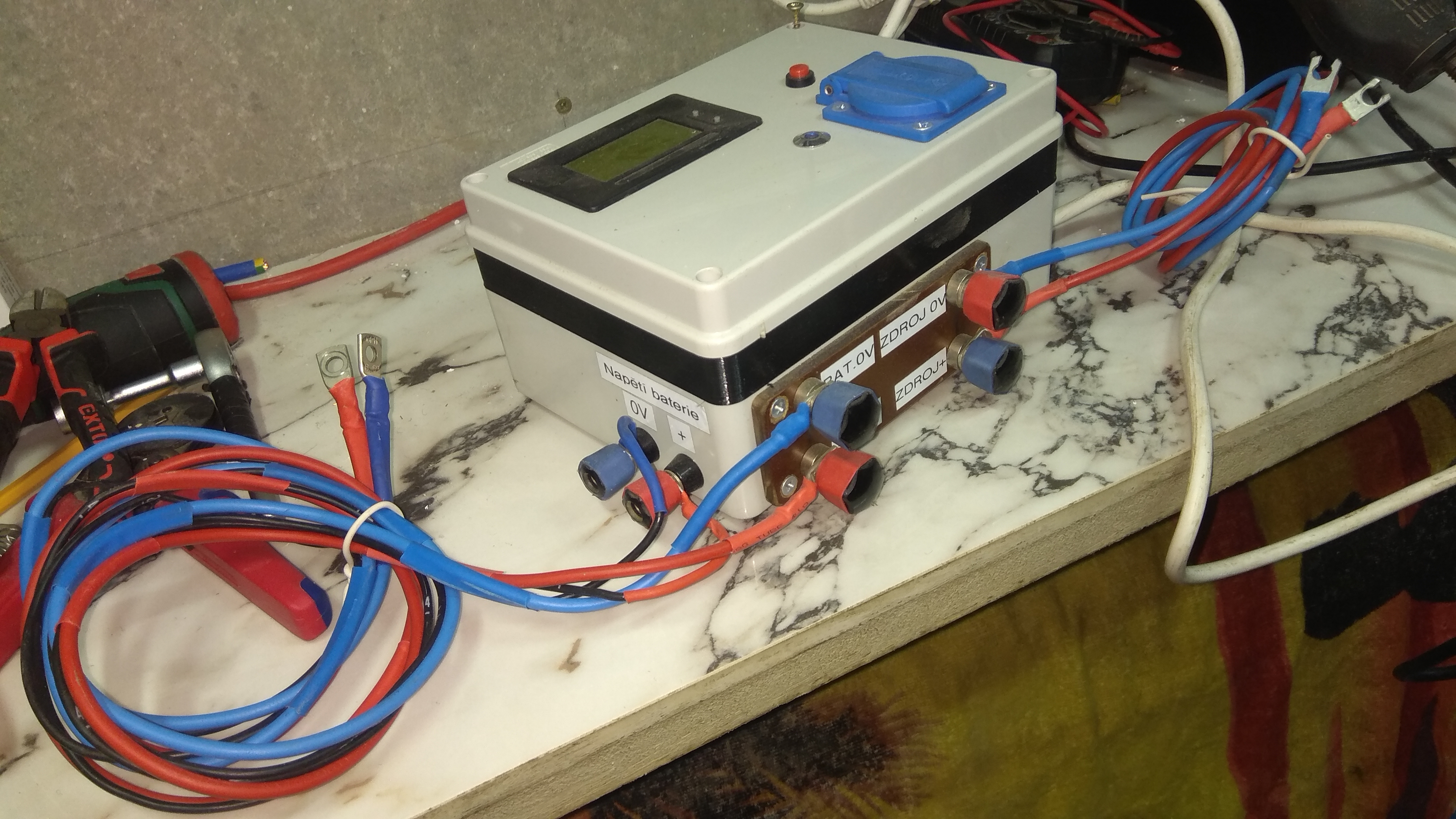 Snímání napětí a proudu je samozřejmě čtyřvodičové.Pojistka je pro případ selhání nabíječe aby nedošlo zpětným proudem k požáru nebo vybití baterie.Tlačítko na panelu nahazuje stykač což při skončení nabíjení zabranuje cyklování po odlehčení baterie a poklesu napětí.Krabice je zvýšešna 3D tiskem,stykač byl vysoký.