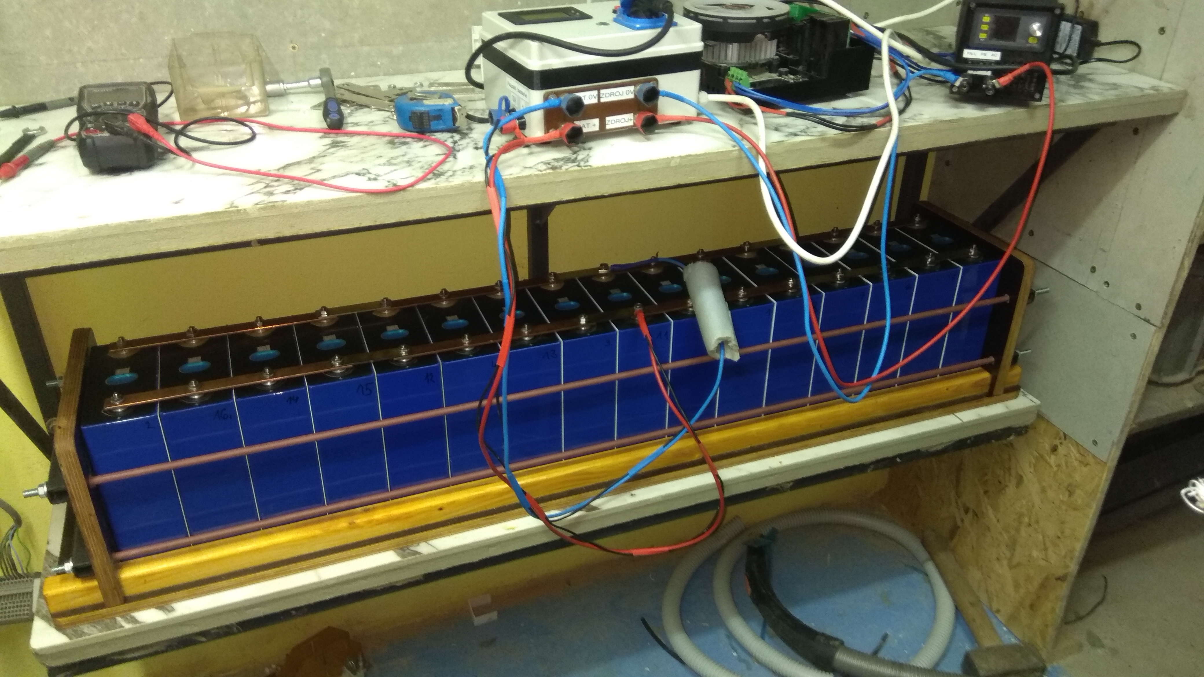 Dva zdroje do PC, připojil jsem ke každému jeden harddisk (jinak zdroj nenastartuje), našel na netu co je třeba propojit, aby zdroj běžel. Využil výstupy 5V. Jeden připojil přes diodu 20A a kus kabelu 1.5mm2 a druhý přes asi 20m 4mm2 kabelu. Pokud byl proud moc velký, zdroje vypínaly, trochu jsem to ladil. Podle wattmetru na primárech teklo do baterek asi 40A, baterky 18x280 Ah, vždy od rána do večera (poctivě jsem to hlídal). Ládoval jsem je 8 dní, odhadem 4090 Ah (v reálu asi míň), konec na 3.508V, po 24 hodinách kleslo na 3.403V. Je to docela náročný.Kolik píše:Mam doma jen laboratorni zdroj 10a tak nevim zda nekoupit neco silnejsiho na 16ks eve 280ah. Co pouzivate?