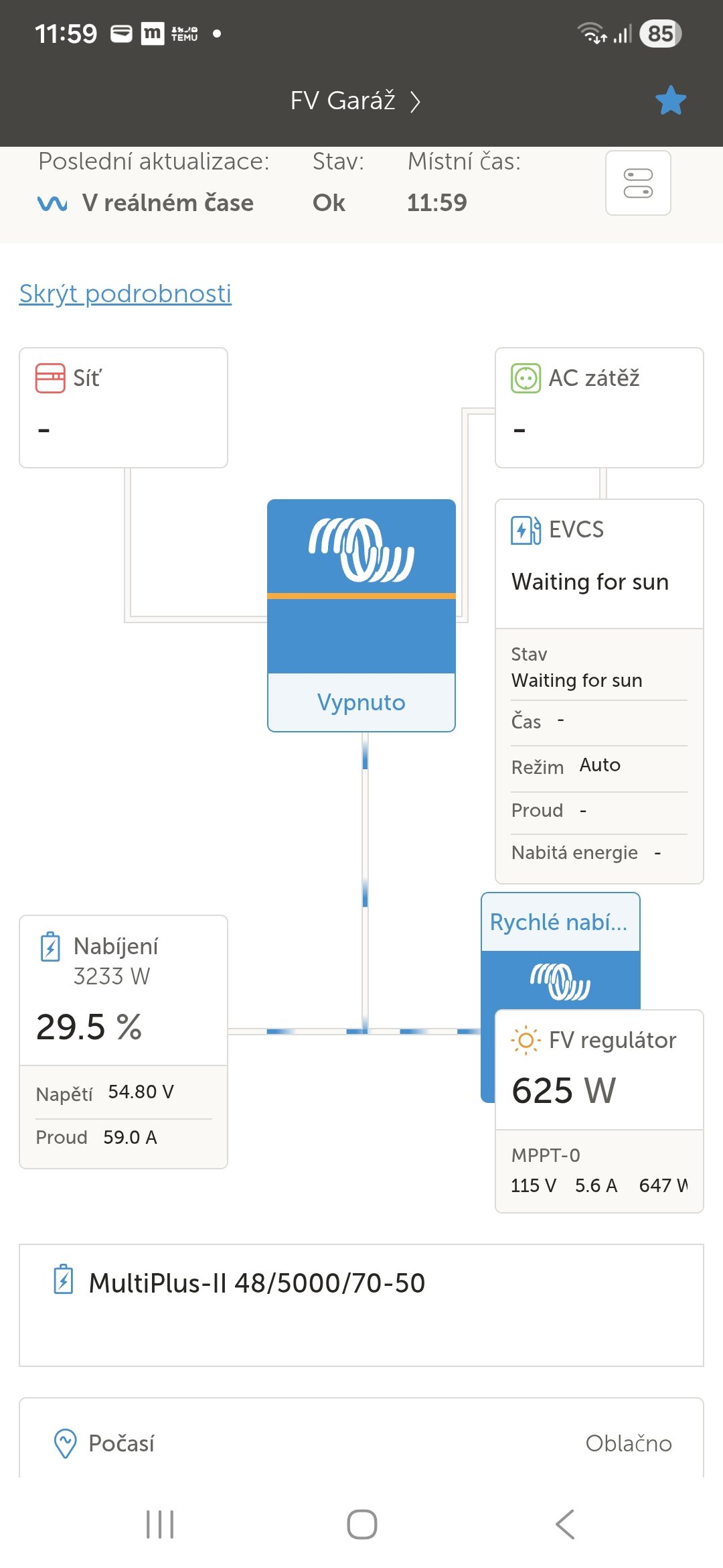 8,08kWp (V - 1,680kWp, J - 3,04kWp, Z - 3,36kWp), Victron MP2 5000VA, 2 * (Victron MPPT 250/85), 2 * ( LiFePo4 16x 280Ah Eve), Victron Smartshunte + BMS