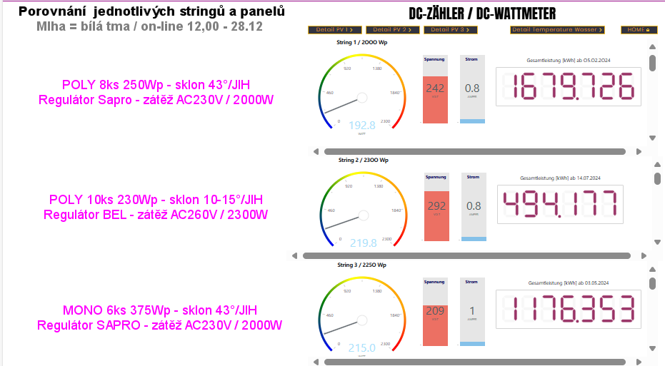 Porovnání všech již 4 stringů a teploty vody bojlerů 1-3 : POROVNÁNÍ