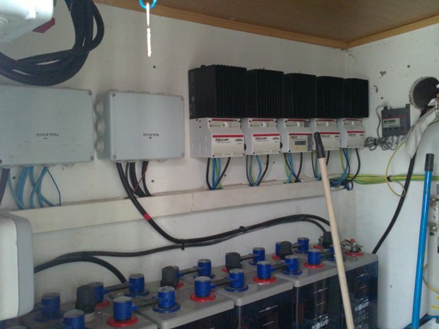 7,1kWp - 8x3 panely Renesola 240Wp, 2x3x235Wp lightway, 2xTristat TS60, trakční 48V 2x750Ah olovo, 2xměnič Studer XTM 4000, SDS Micro, solární dvouosý tracker se třemi panely