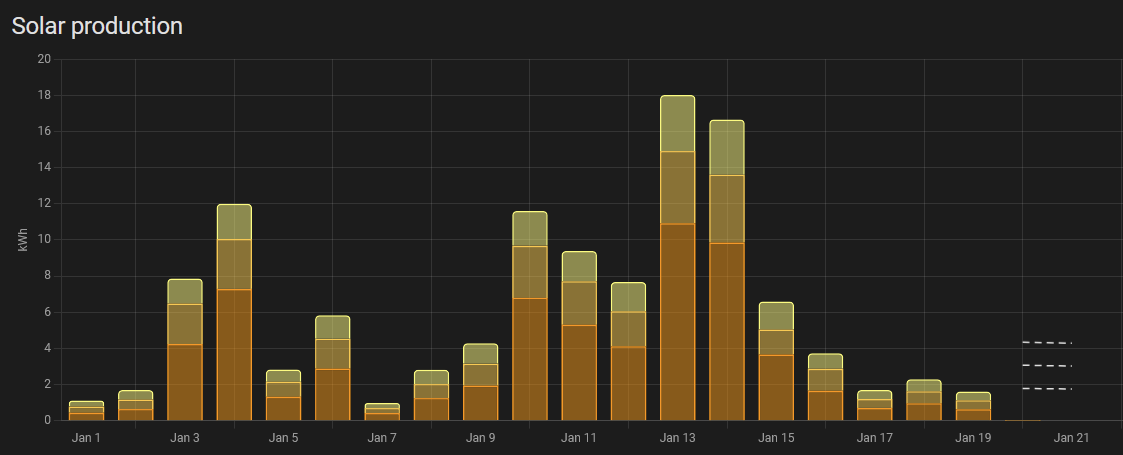 U nás na SV zatím hodně dobré podmínky, v neděli 29,9kWh, nabil jsem baterky na 100% a přepnul komplet spotřebu na FV, v pondělí 23,4kWh, úterý bylo slabší 10,4 kWh, středa 24,01kWh, včera 13,25kWh, dnes má být zase asi polojasno, za leden zatím 236kWh, všechny údaje DC z panelů.