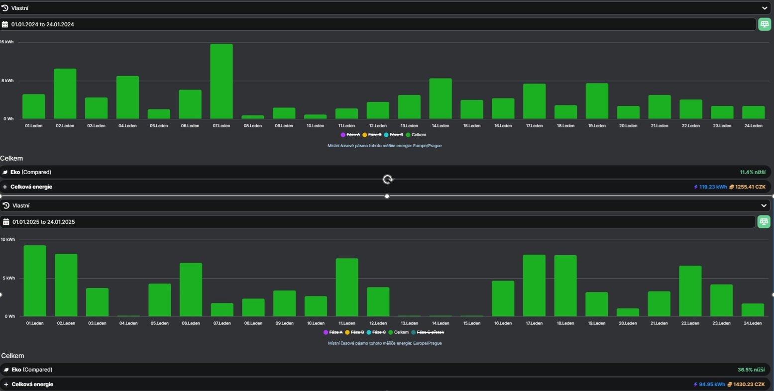 U nna je januar 2025 zatial to iste co januar 2024. Solar tvori 42% spotreby, na grid-e som kazdy 3ti,4ty den (podla stavu pocasia). Zmena prichadza od 1.2, ked to zacne rast na 75% samospotreby a viac.