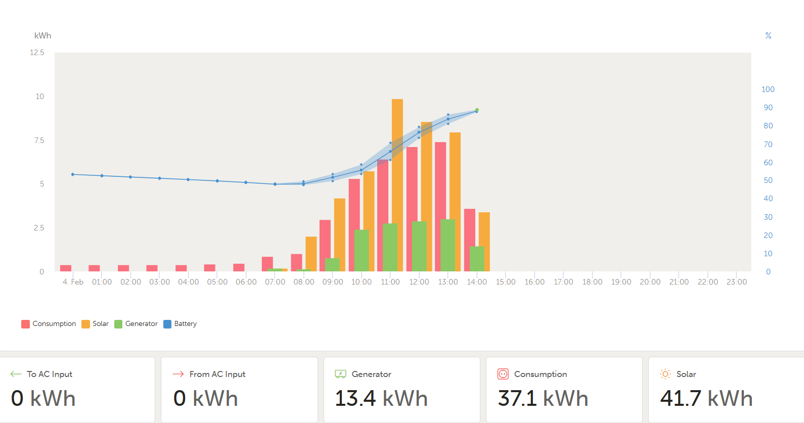 6x Longi 370 JV+ 6x Longi 370 JZ 4440 Wp, 3x430 Longi JZ 1290 Wp | Victron 150/35 MPPT | Must PV1800 Pro 5,2 kW | 16x LiFePo4 280Ah