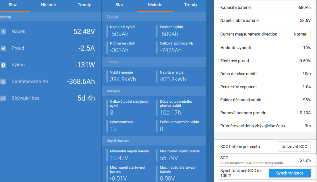 Já nemám vůbec AC IN ani na jednom z Multiplusů zapojený - je to ostrov a počítám s tím, že budu nějakou dobu nabíjet externí nabíječkou v mezi období a pak to mohu přepnout na síť.Keraj píše: stř črc 30, 2025 8:06 amTak ty spotřebované Ah versus % by mohla dělat vyšší reálná kapacita baterie ( u mne to je cca 5%) a nižší napětí pro 100 % SoC...