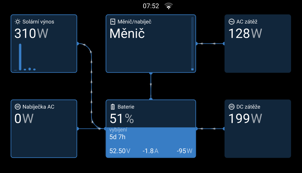 Pak teprve v dlazdici DC Power ukazuje spravne hodnoty. Uz tam nic nedopocitava, jen secte ty DC SYSTÉMY. V nastaveni mam, ze DC spotrebice jsou pritomny. Soucty plusu a minusu reglu, baterek a dalsich menicu +/- sedi.
