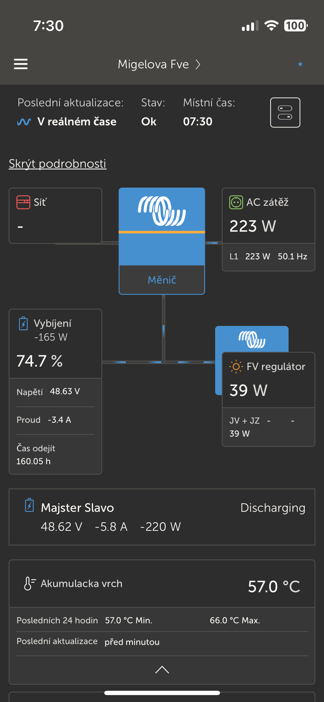 ostrov skoro 8kWp neustále ve stádiu zrodu: smartshunt(ex WBJR), MPPT150/45, MPPT 250/100(ex midnitesolar 150 clasic lite), 16S a různě P cca 340Ah Winston, MP II 5000,( ex Powerjack 8kW, ex samodomo cca 4kW). 48V DC rozvody a spotřebiče.
