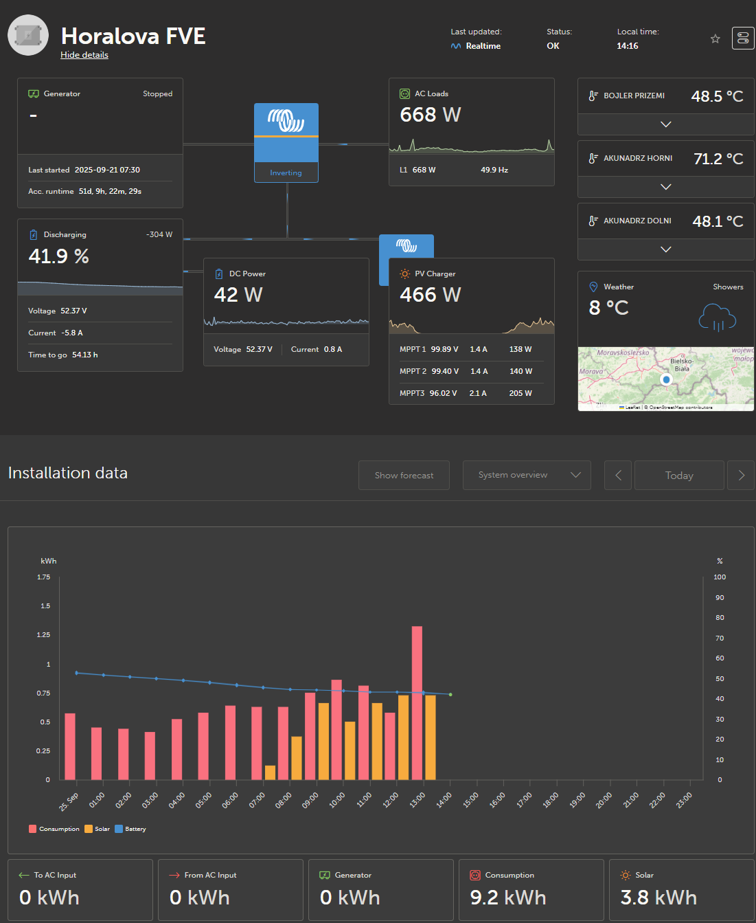 ostrov skoro 8kWp neustále ve stádiu zrodu: smartshunt(ex WBJR), MPPT150/45, MPPT 250/100(ex midnitesolar 150 clasic lite), 16S a různě P cca 340Ah Winston, MP II 5000,( ex Powerjack 8kW, ex samodomo cca 4kW). 48V DC rozvody a spotřebiče.
