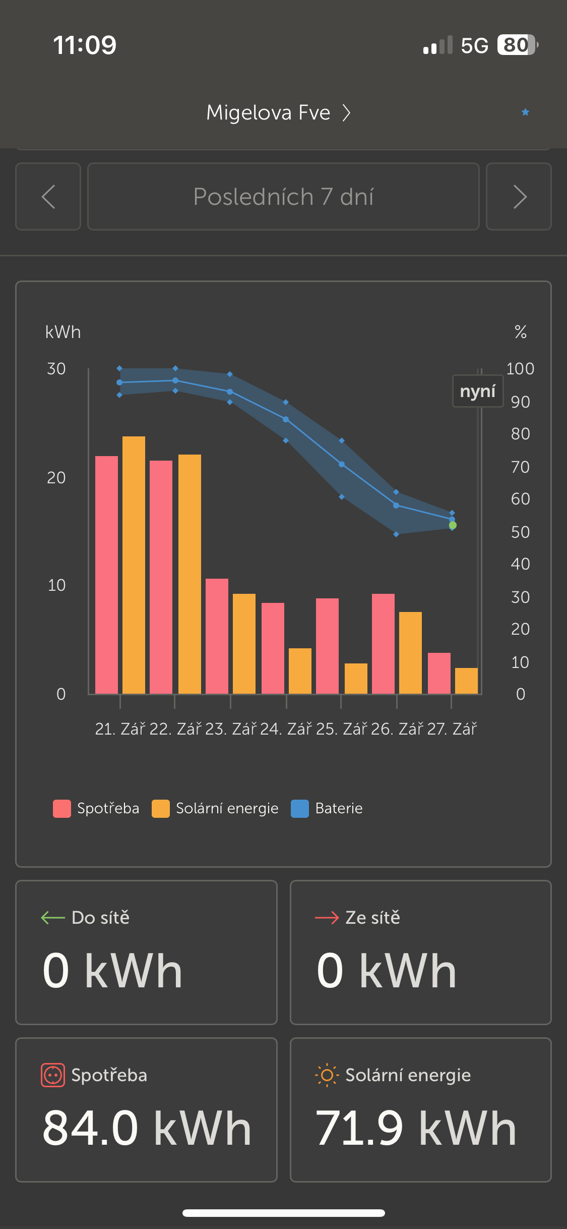 Za pul roku a par tydnu jsme ve dvou bytech dali asi 4 kWh ze site, zbytek z FVE.