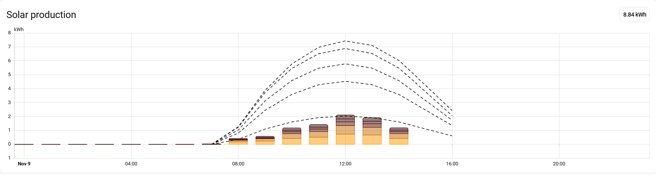 No dnes hnus.Z pole 4500Wp výroba 1kWh.Mám 6 témĕř stejných polí. Celkem 6kWh.