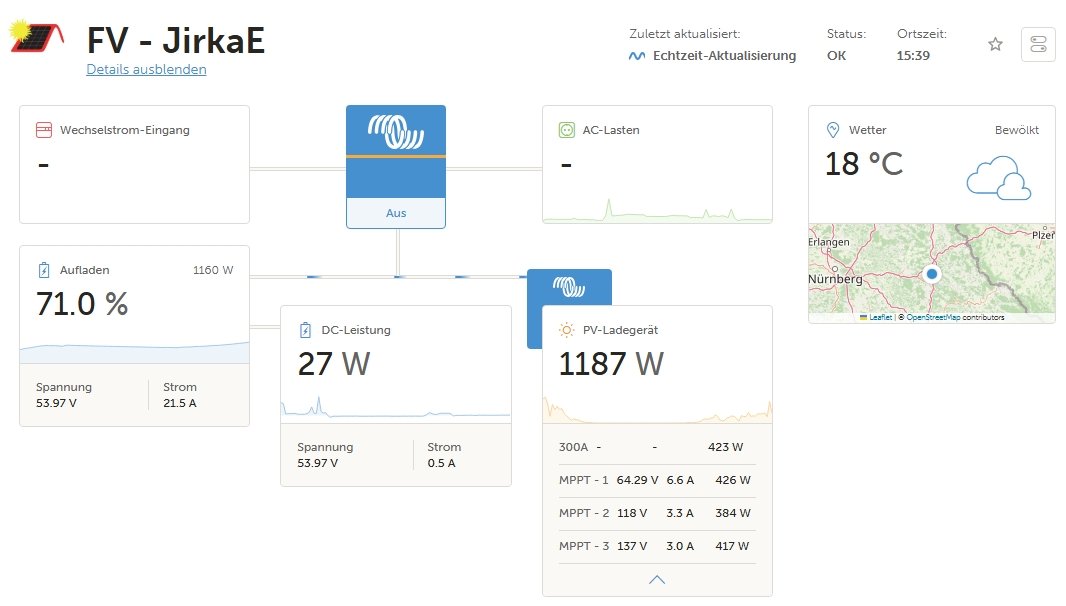 Viz obrázek, výkon z MPPT a zátěž na AC OUT... (tak jsem to vysledoval já, MPPT mám dvě)