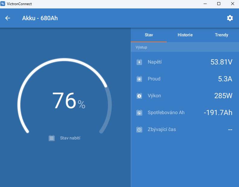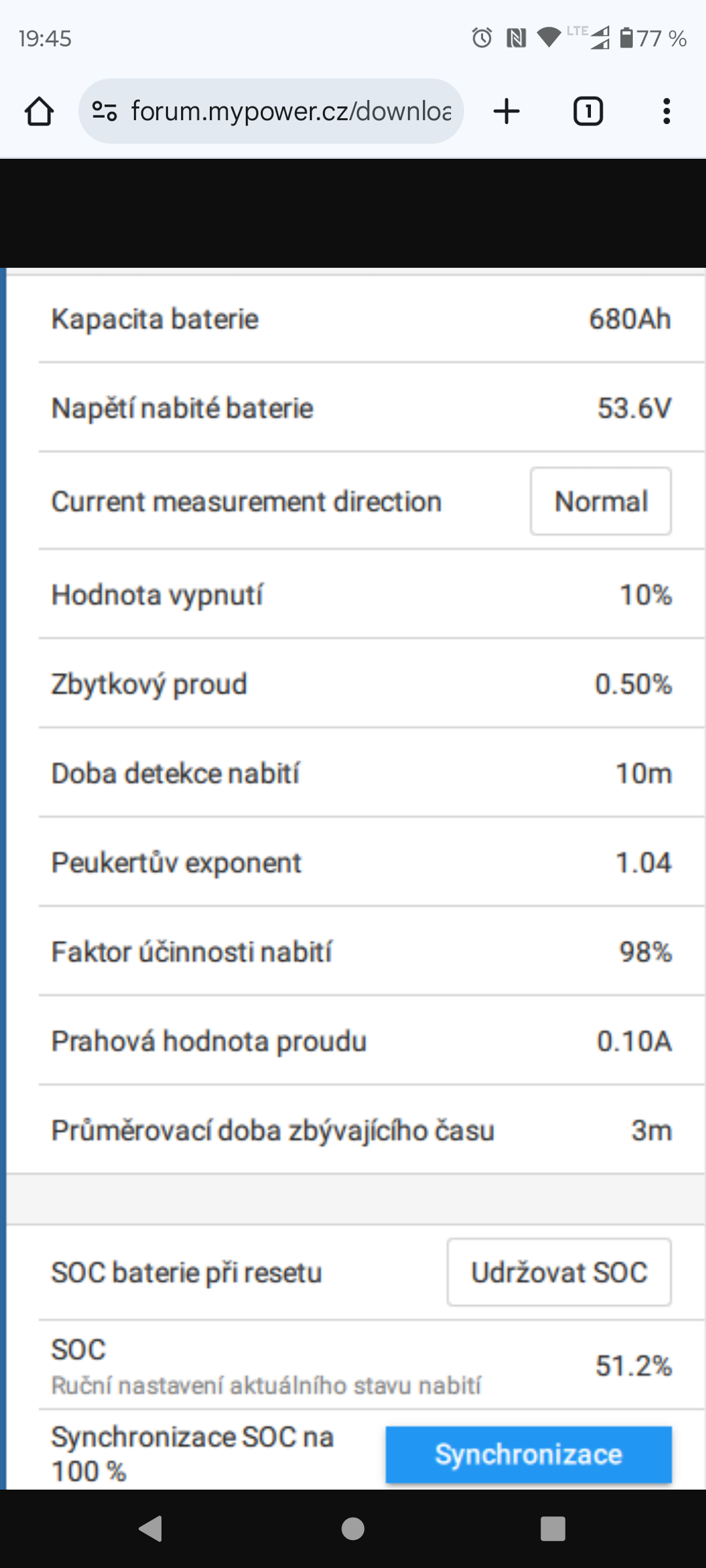 Jsi si jistý, že chápeš logiku pokynů VICTRON správně ... ?? To co tam má je horní napětí - kam až systém nabíjí baterii, resp kde ji SHUNT bere za plnouglottis píše: stř črc 30, 2025 8:25 amTohle je sporne, sam victron radi dat tam float. Vetsi problem je ten tail current - zbytkovy proud. 0,5% je hodne malo i na 680Ah baterie. To je 15A a jeste docela dlouha doba klidu ... 10 minut. 10 minut musi byt proud do baterie mensi nez 15A a napeti vyssi nez 53,6VAldron píše: stř črc 30, 2025 7:50 amTo napätie nemáš dobre. Sledujem, píšem, ale nepostrehol som, že by ti niekto radil dať tam float hodnotu. 53,6V rozhodne nezodpovedá 100% nabitiu. Daj tam bulk-0,1V ako si to mal predtým a bude to OK.