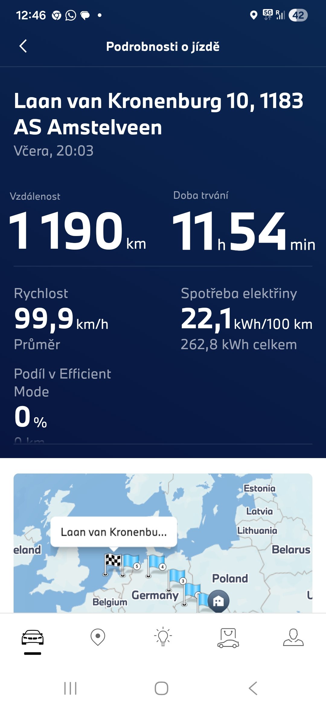 Podnikl jsem nejdelši cestu z EV do Amstrdamu za synem.Mám to 1200km celkem 4 nabíjení.Z toho 1 zastávka oběd,1 na výbĕr a objednánáni hotelu a 2 kafe na relax a záchod.