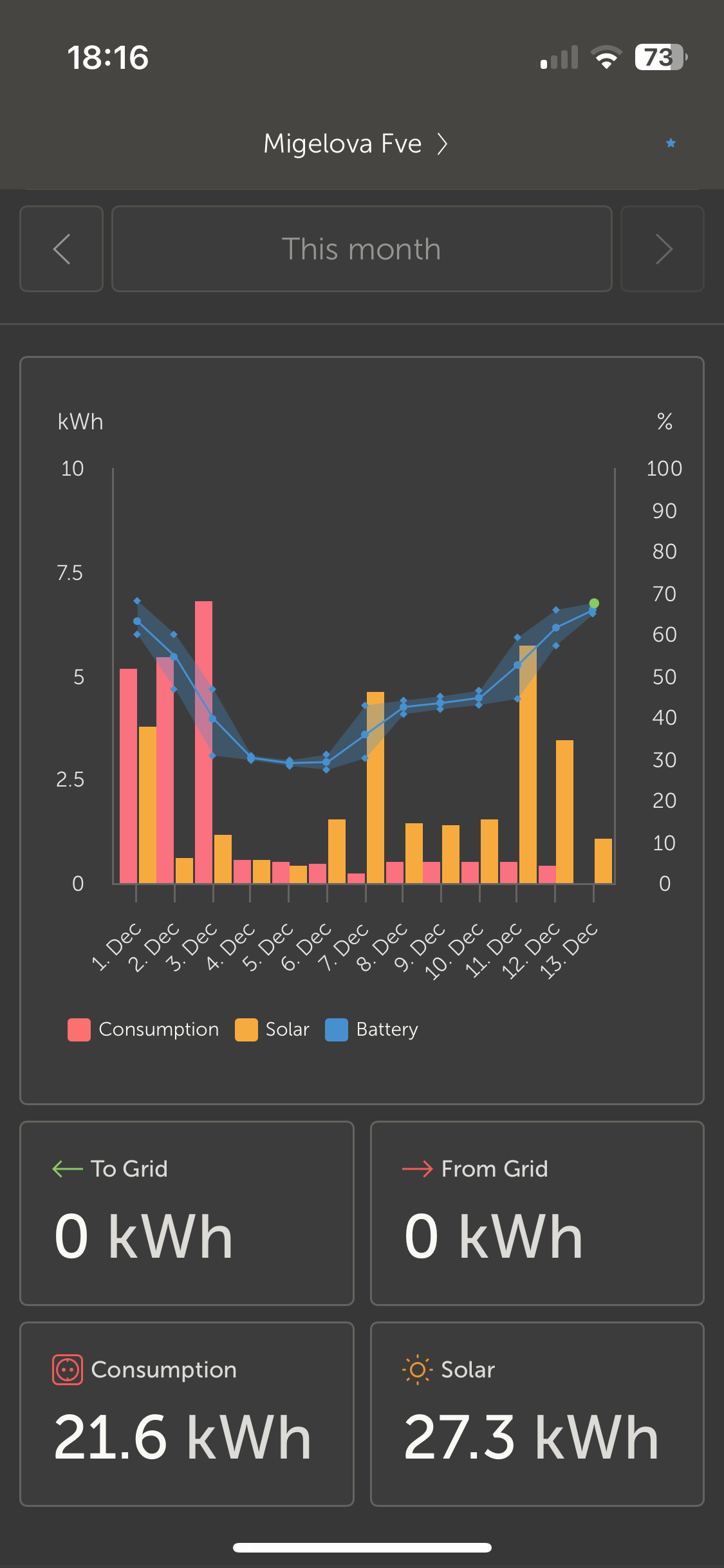 Nejvĕtši tma je u u nás na Hané.Já mám z 32kWp v prosinci výrobu okolo 100KWh.Na grafu je cca polovina fv.Tĕch 194kWh spotřeby je spotřeba EV.
