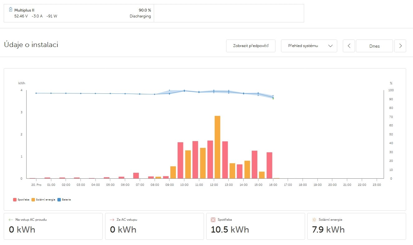 Dle mé zkušenosti plot směr Jih - PANELY DAH SOLAR DHN-60R18-DG BB 500WP (CELOČERNÝ) BIFACIAL 3s x 3p > (111,3V (131,1Voc) 40,4A (43,44A max.) > 4 500Wp - Victron SmartSolar 150/85-Tr VE.Can MPPT.J4ST3R píše: pon pro 15, 2025 5:20 pmAhojte vedel by niekto poskytnut relane data vyroby po dnoch v tomto hnusnom počasi kto ma panley na kolmo ( plot /fasada) a aku ma orientaciu panelov a kolko KWP