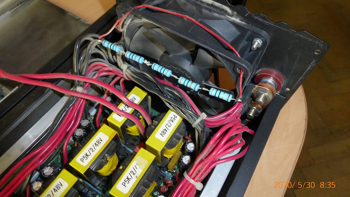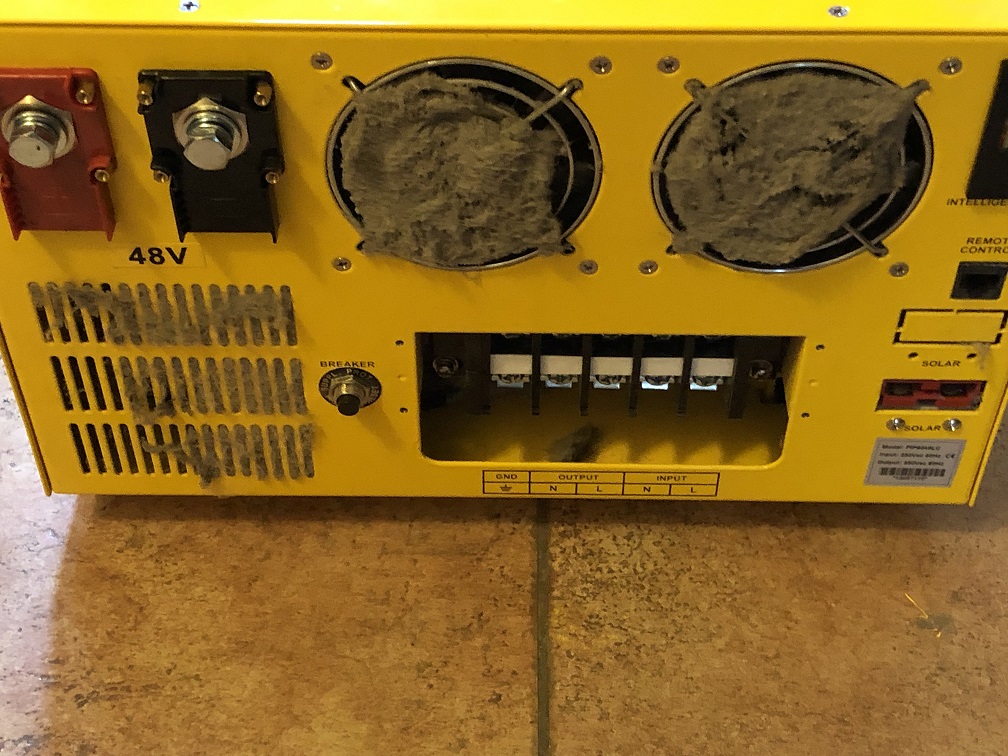 Já jsem vyměňoval všechny ventilátory hned u nového stroje za typ Maglev (ložiska s magnetickou levitací). Jsou o poznání tišší a měly by mít i větší životnost. Obracel jsem i směr průchodu chladícího vzduchu tak, aby směřoval zespodu nahoru a nahrazoval jsem původní ac pohon ventilátorů se dvěma stupni výkonu (75V a 230V AC) DC pohonem na 48V s kvazispojitou regulací (256 stupňů rychlosti) podle teplot průběžně měřených na kritických místech střídače (4 čidla DS18B20). Vzhledem ke skutečnosti, že tento typ střídače obsahuje sedm až osm (dle verze a vybavení) ventilátorů, neprojevilo se ucpání dvou z nich na funkci střídače (ostatní běžely o to rychleji, aby se teplota udržela na stanovené hranici i při plném výkonu střídače). Určitá redundance chlazení rozhodně není u měničů tohoto výkonu na škodu.