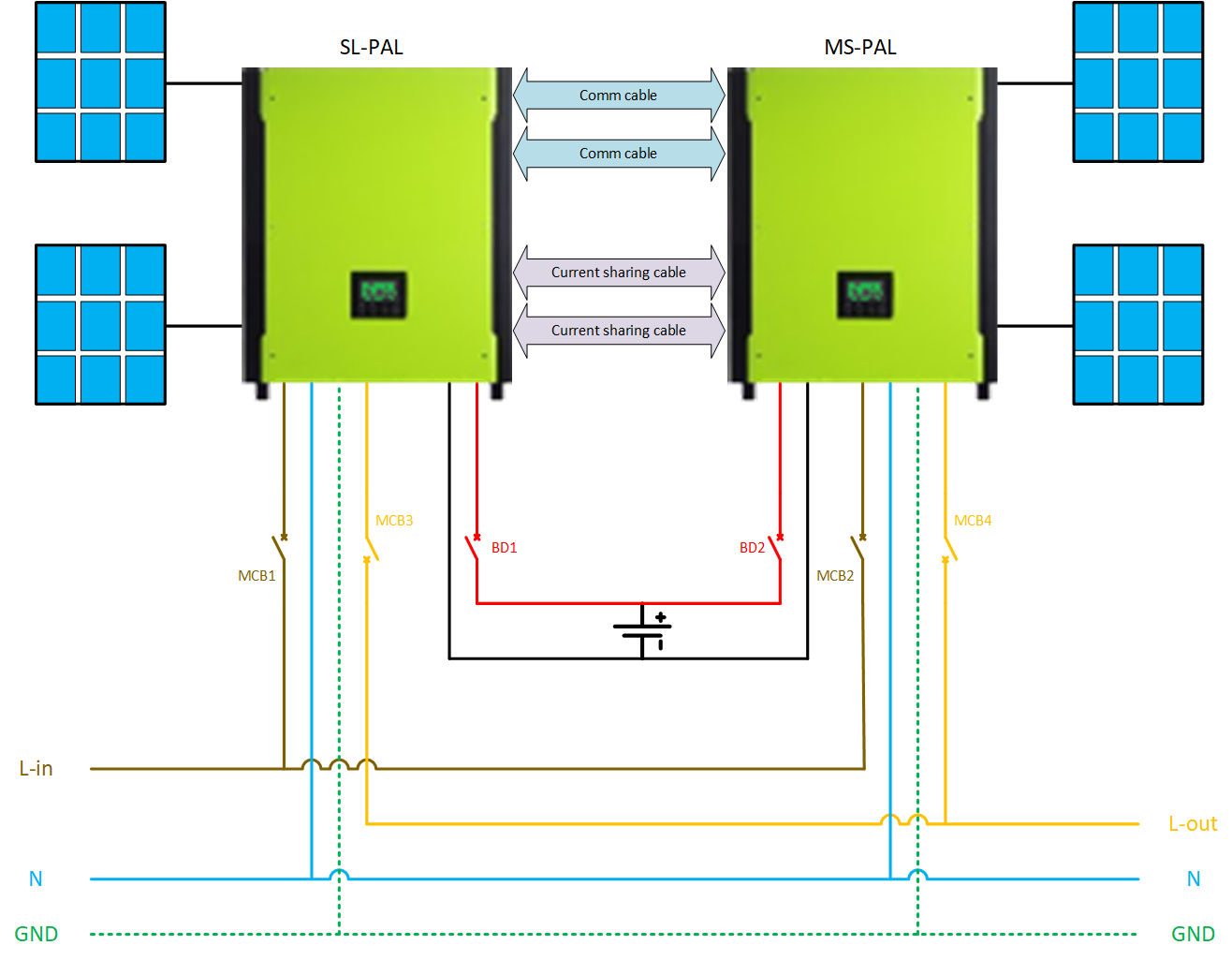 Dva InfiniSolar 5K plus v tandemu. Oproti obrázku níže jsem provedl změnu v zapojení panelů tak, že Slave měnič nyní k sobě nemá připojeny žádné stringy. Master měnič má připojeny všechny čtyři stringy. Jelikož měnič má jen dva MPPT vstupy, vždy východní a západní string jsem spojil paralelně dohromady a každému přidal MC4 diodu. 72 panelů je tedy rozděleno na 2 x 18s2p. V případě ambientního světla by se tak měl proud do každého vstupu zvětšit dvojnásobně. U přímého osvětlení sázím na to, že Slunce bude přímo ozařovat jen východní nebo jen západní pole, nikoliv východ i západ najednou. Nejblíže by taková situace mohla nastat jen v poledne. V tomto zapojení tedy Slave měnič pouze odebírá energii z baterek a DC sběrnice, vyrábí 50% AC výkonu, ale jeho MPPT vstupy se nepoužívají.