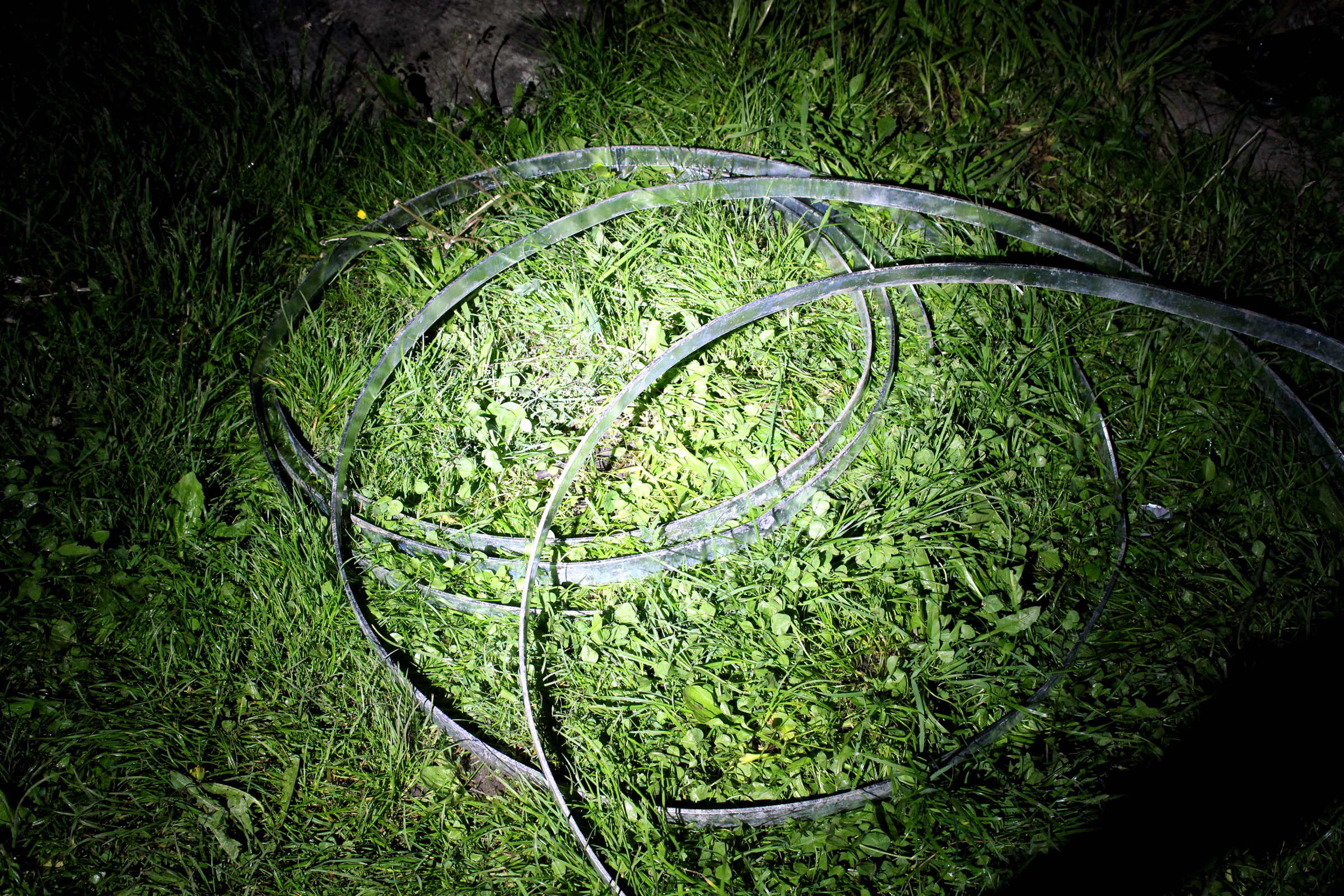Hektarová hala 15m výška, uprostřed pole, železobeton. Uprostřed haly na ploché střeše aktivní hromosvod, který pochytal blesky z okolí haly.
