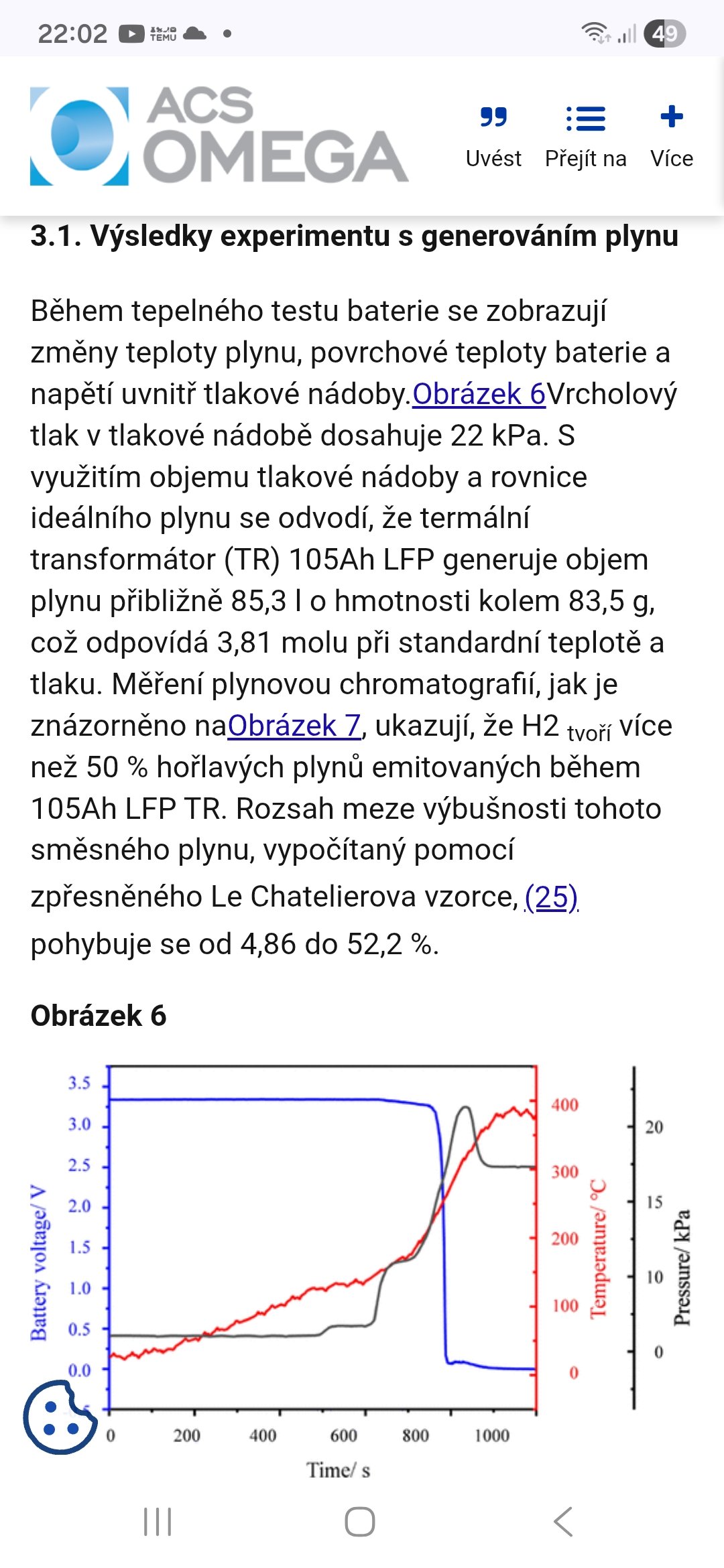Zásadní informace je, jak poměrně málo energie stačí k zahřátí článku na nějakých 150st, aby začal silně plynovat. V pokusu zahřívali článek výkonem 500W a trvalo jim to 800s.To je v nesprávných elektrikářských hodnotách 112Wh(joule schválně nepoužívám). Na naše články okolo 300Ah je potřeba cca 3x tolik tzn: 350Wh