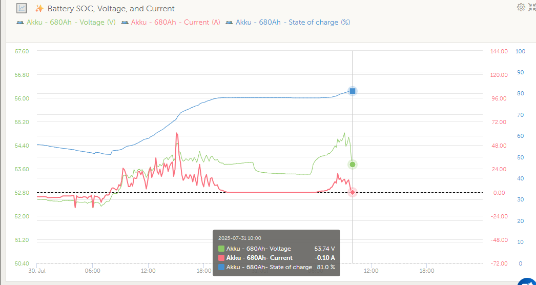 Dálkově můžu vypnout i AC nabíječku i MPPT regulátory - a můj plán je, že pak jdu do dílny a odpojím úplně vše zůstane jen ten jeden hlavní shunt na měděný kolejnici a synchronizuju vše ručně na 55V - když mám na shuntu nastaveno 55V (v MPPT mám 55,2V) a taky pro sychr kalibruju nulu na proud a smažu všechna data z historie = bude jeden pevný bod pro všechno.