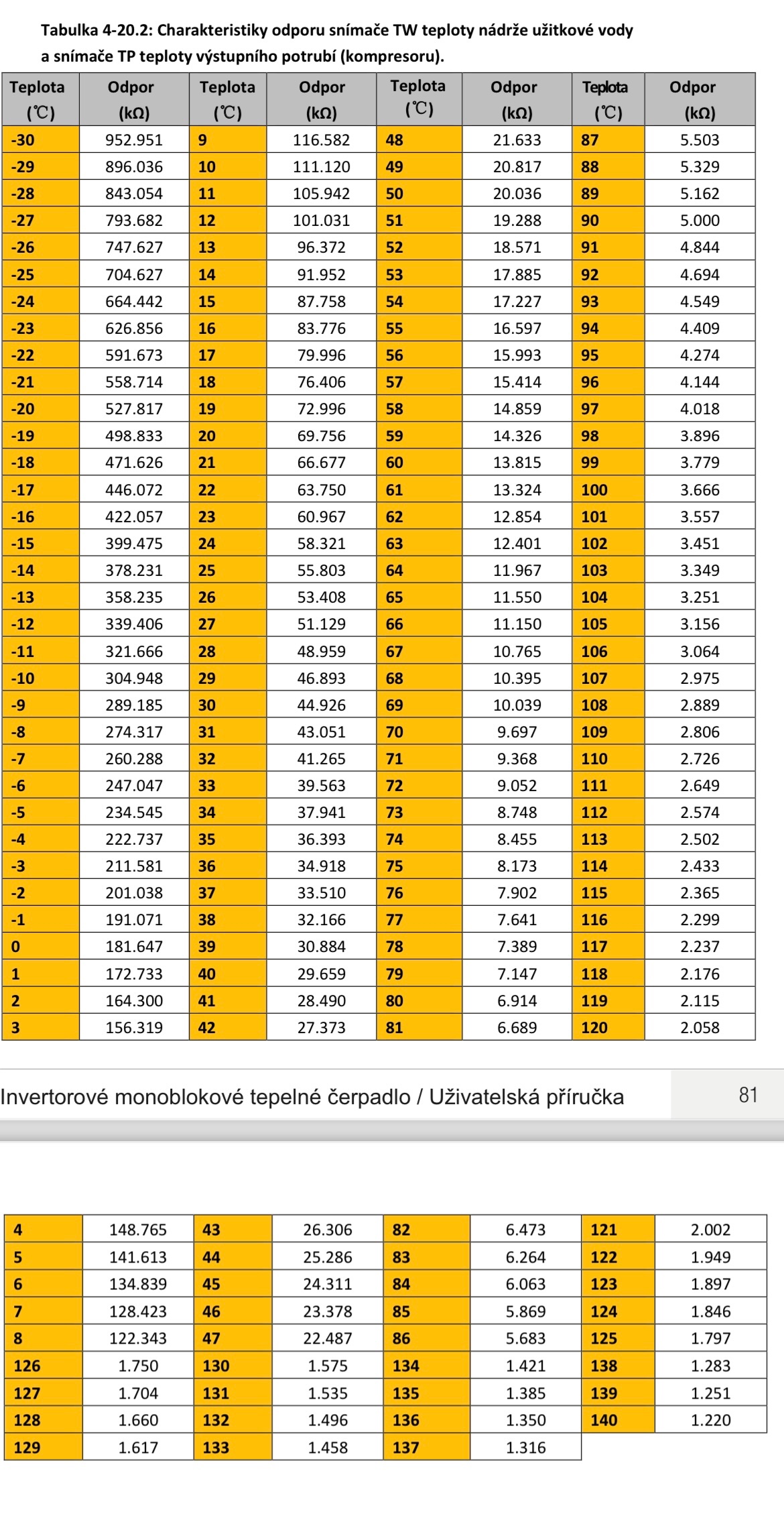 K té tabulce pro dané NTC: ta čidla se často dělají tak, že je k NTC připojený paralelně nějaký odpor a mění tak charakter závislosti odporu na teplotě.