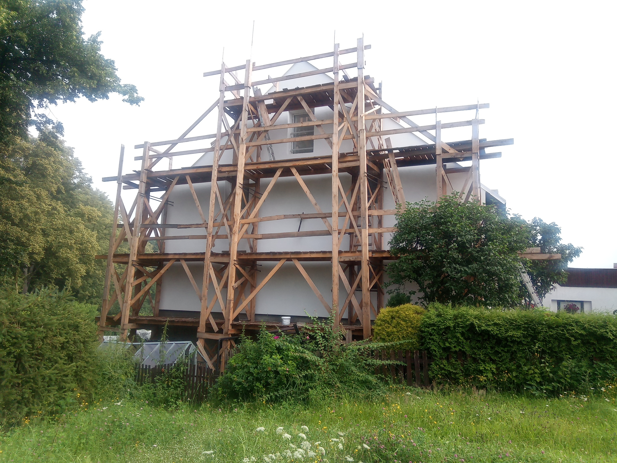 Dnes jsem konečně dodělal lešení na štítě poté, co mne několikrát vyhnal déšť. Akorát jsem se dnes dozvěděl nemilou zprávu od klempíře. V týdnu měl úraz, tudíž má sešroubovanou ruku. Tak abych se ještě dal do klempířiny.