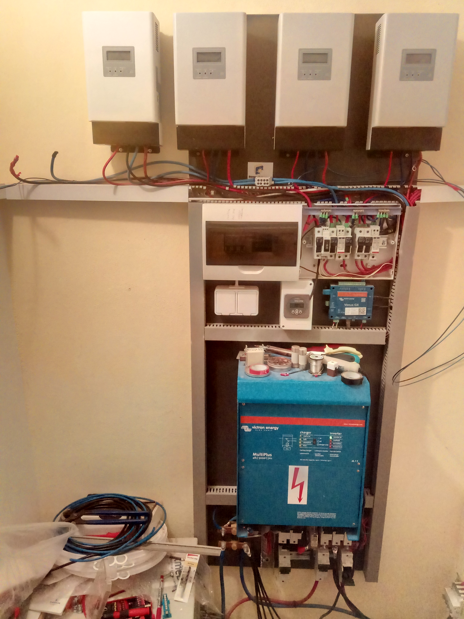 ostrov skoro 8kWp neustále ve stádiu zrodu: smartshunt(ex WBJR), MPPT150/45, MPPT 250/100(ex midnitesolar 150 clasic lite), 16S a různě P cca 340Ah Winston, MP II 5000,( ex Powerjack 8kW, ex samodomo cca 4kW). 48V DC rozvody a spotřebiče.