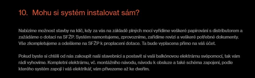 Jak už z toho popisu vyplývá je to primárně zaměřeno na řešení s dotacemi. Při řešení s dotací je v současnosti povinně vyžadována realizace dodavatelským způsobem tj. realizace na klíč firmou, ale dle mého názoru to pak vyjde cenově náročněji (rozhodně víc než ta balkonovka za 2500 Kč). Nicméně jak to bude vycházet konkrétně to už si musí případnými bližšími dotazy u té firmy prozkoumat každý sám.Ommy píše:Nabízíme možnost stavby na klíč, kdy za vás na základě plných mocí vyřídíme veškeré papírování s distributorem a zažádáme o dotaci na SFŽP. Systém namontujeme, zprovozníme, zařídíme revizi a veškeré potřebné dokumenty. Vše zkompletujeme a odešleme na SFŽP k proplacení dotace. Ta bude vyplacena přímo na váš účet.