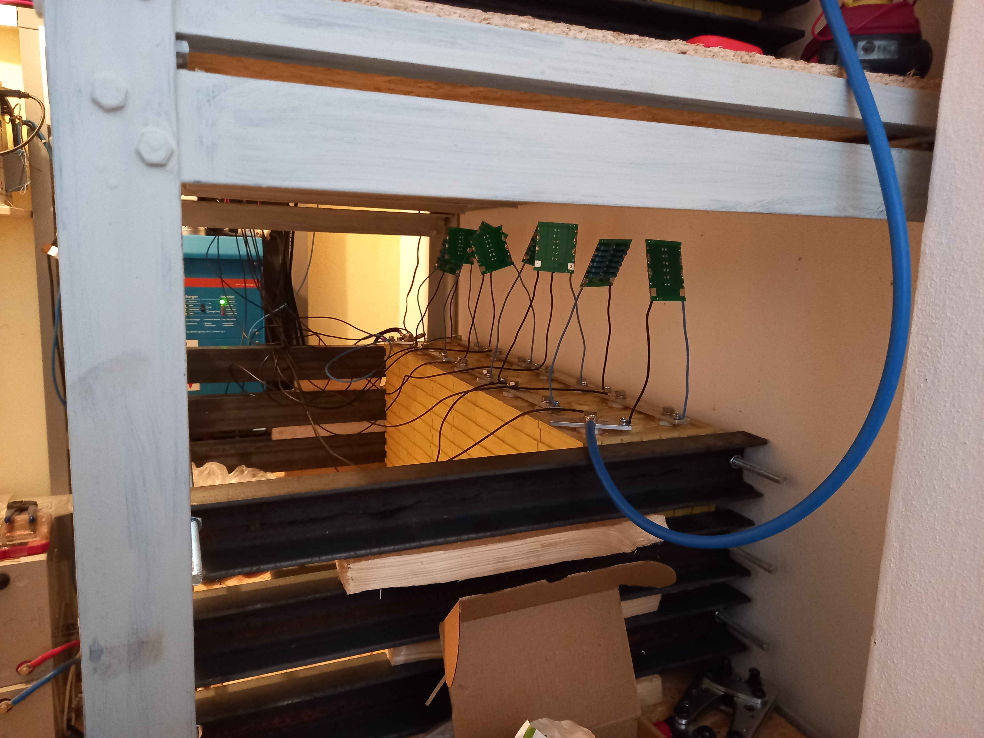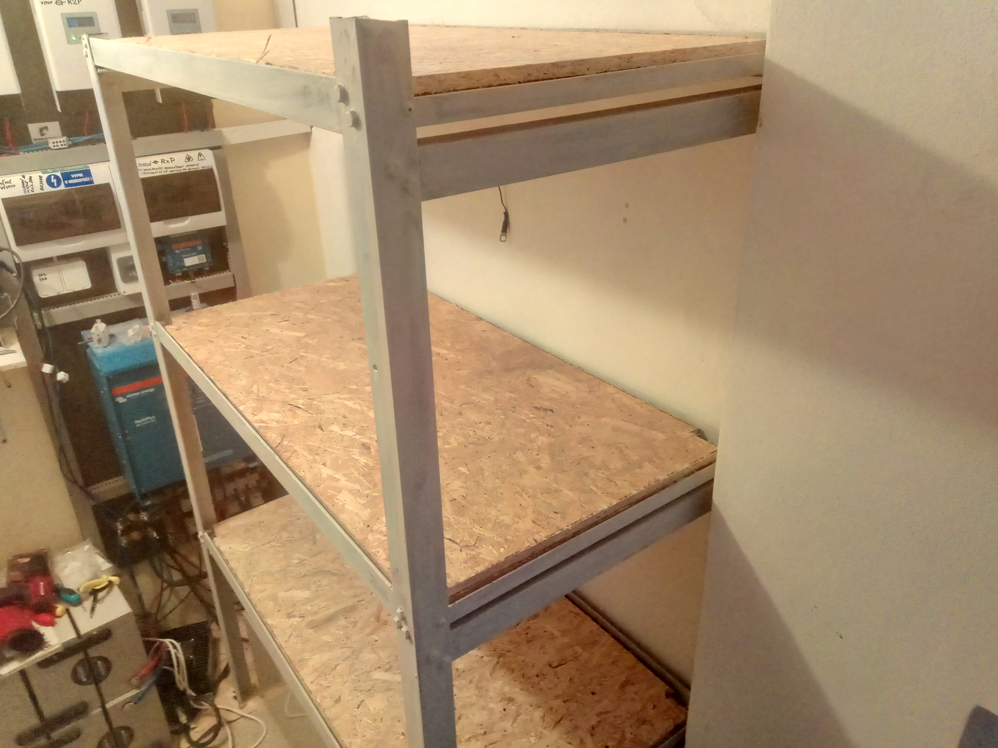 Dneska jsem dělal regál na baterky. Ještě ho zbývá natřít a zasadit poličky. Konstrukčně ho řeším tak, aby se do první a druhé police vešly tři sady 200Ah lifepo4. Tedy 2x 3P8S zapojeno v sérii.