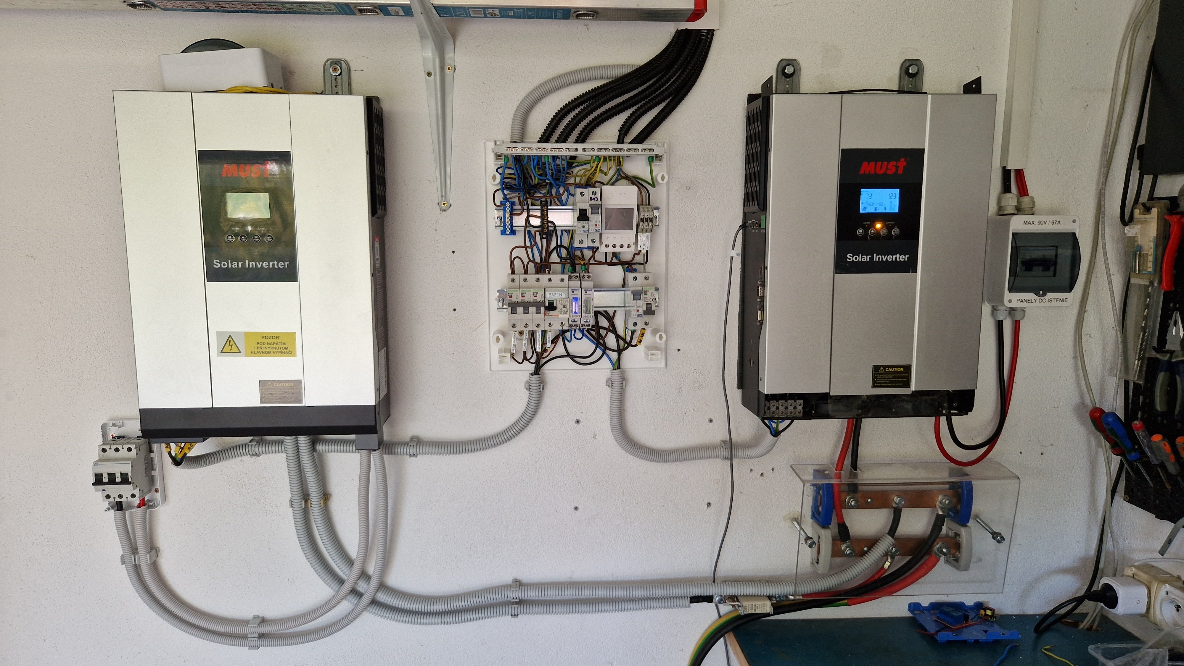 MUST 3KW 80A MPPT 24V/ 3,75kWp stringy 5s3P 200wp + 5s1P 150wp. 2 měnič MUST 3KW 80A MPPT 24V 6370Wp stringy 2S4P 400wp bifacial + 2S1P 410wp + 2S3P 395wp Baterie 28KWh lifepo4 (4X 8S 280Ah EVE), Celek tedy 10120Wp