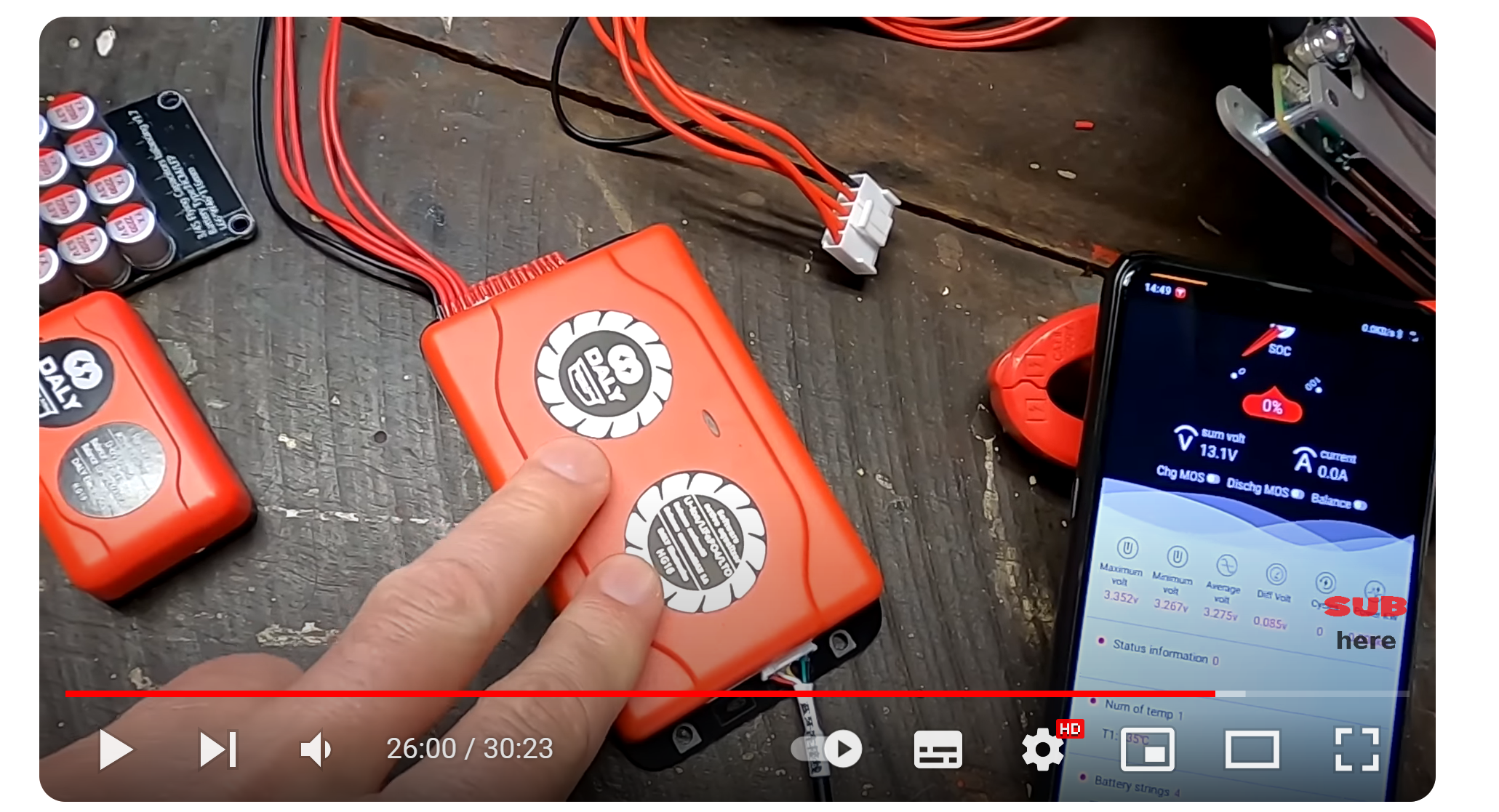 Natom videu když se klikne v daném čase, má na stole tři balancery a jeden BMS který moc není vidět, ale má ho na baterii.