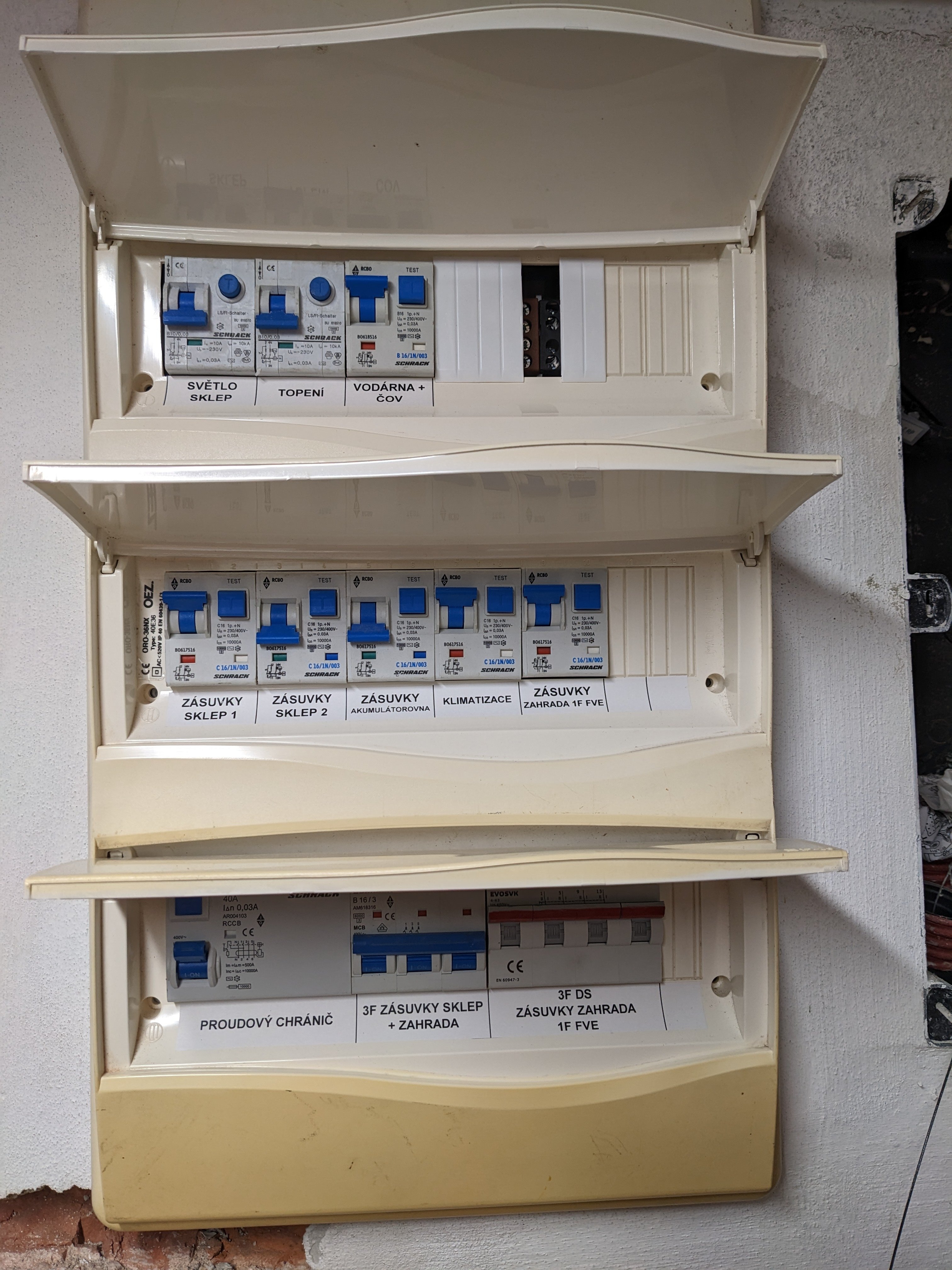 B nemám, mám jen AC, rozvaděč pro 1. patro: sklep:Term píše: pát led 05, 2024 12:04 pmJaké máte chrániče typu B vy? A jak je máte rozmístěné? Já ve starém domě mám aktuálně jeden 3F na vstupu a hotovo... druhý paralelně v garáži.