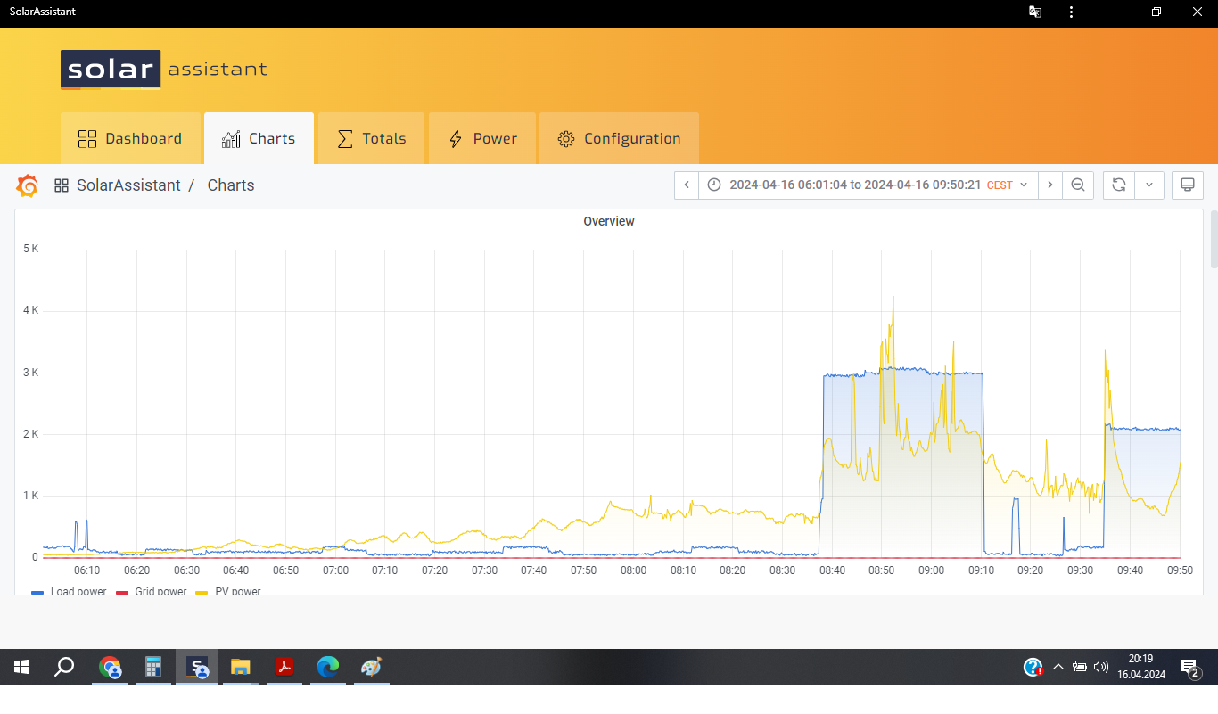 Posilam 2 obrazky.Dnes tady teda bylo hnusne,takze to neni tak markantni,ale mezi 8:40 a 9:10 je nadherne videt kolik toho zustava na strese kdyz nezapnu nejakou spotrebu.Bez problemu do spotreby vyrobim ve slunecny den ted v dubnu 25-30kwh.Kdybych mel baterku vybitou na 50% ,tak za tech 10-12h slunecniho svitu ji ani nenabiju bez toho abych musel restartovat menice.
