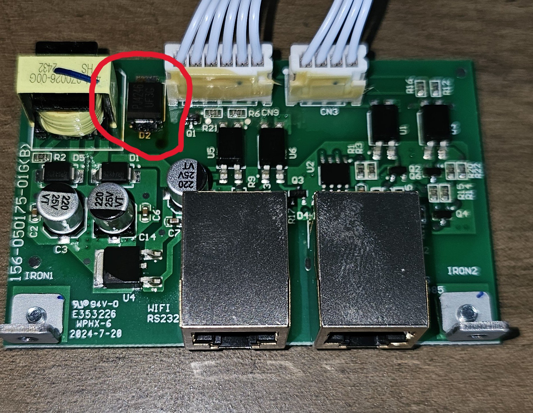 Ta dioda na té desce snad funguje i jako pojistka, která shoří při zkratu na výstupu. Na konektoru pro komunikaci s měničem je totiž 12V, které se používá pro napájení WiFi modulu a pokud se to napětí přes kabel dostane někam, kde se spojí se zemí, tak dojde k tomu, co se stalo tobě.