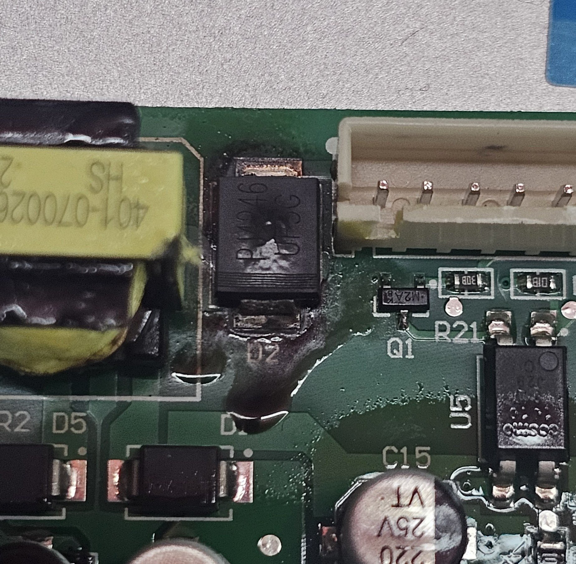Vyndal jsem upečené diody . Jsou zapojene v sérii s primárem trafíčka zdroje. Držely za jednu nožičku, druhá ve vzduchu ohořelá . Pod diodou vypálená díra v plošném spojí a z druhé strany černý lak. Obě diody jsou ale k mému zděšení funkční.