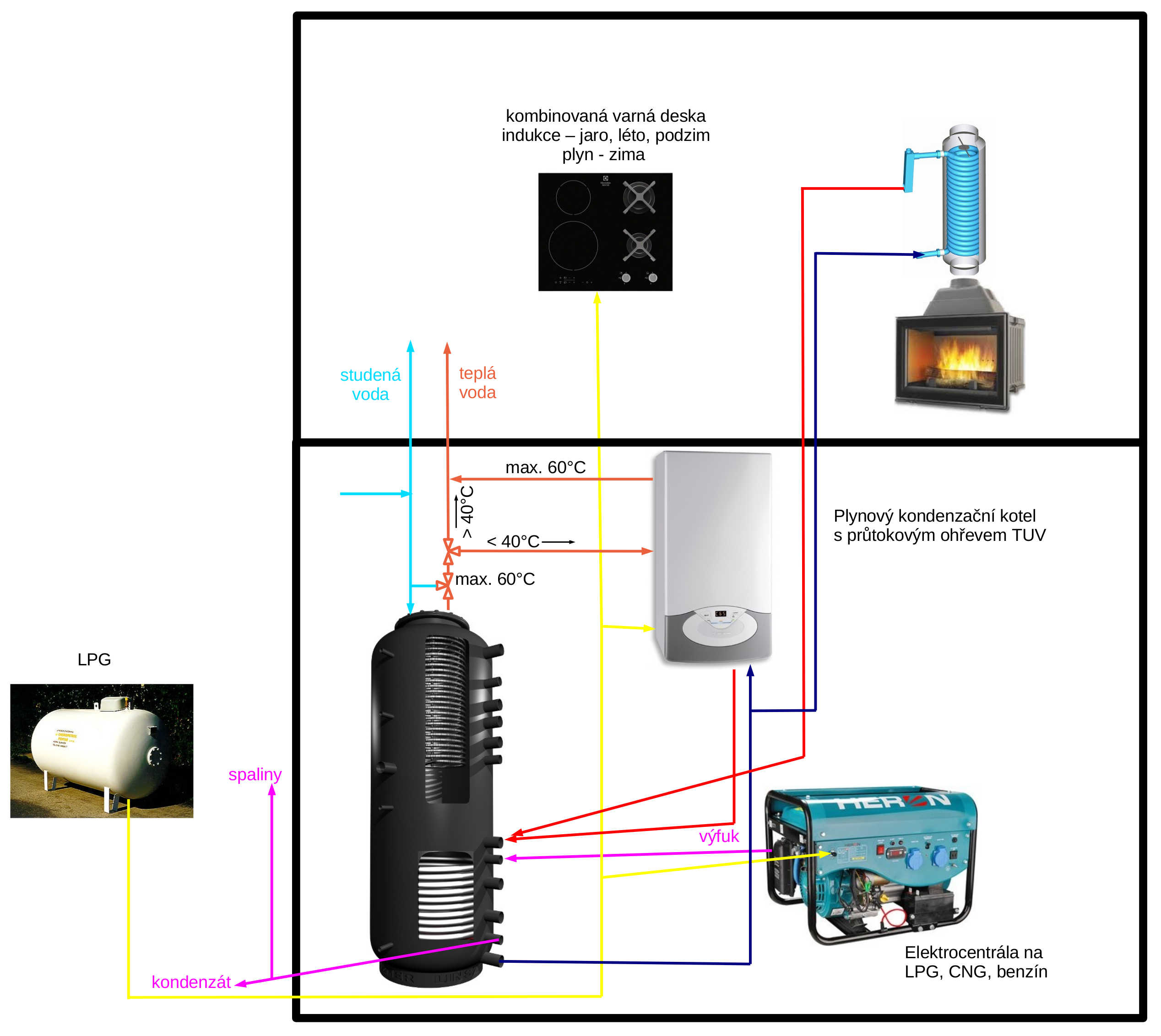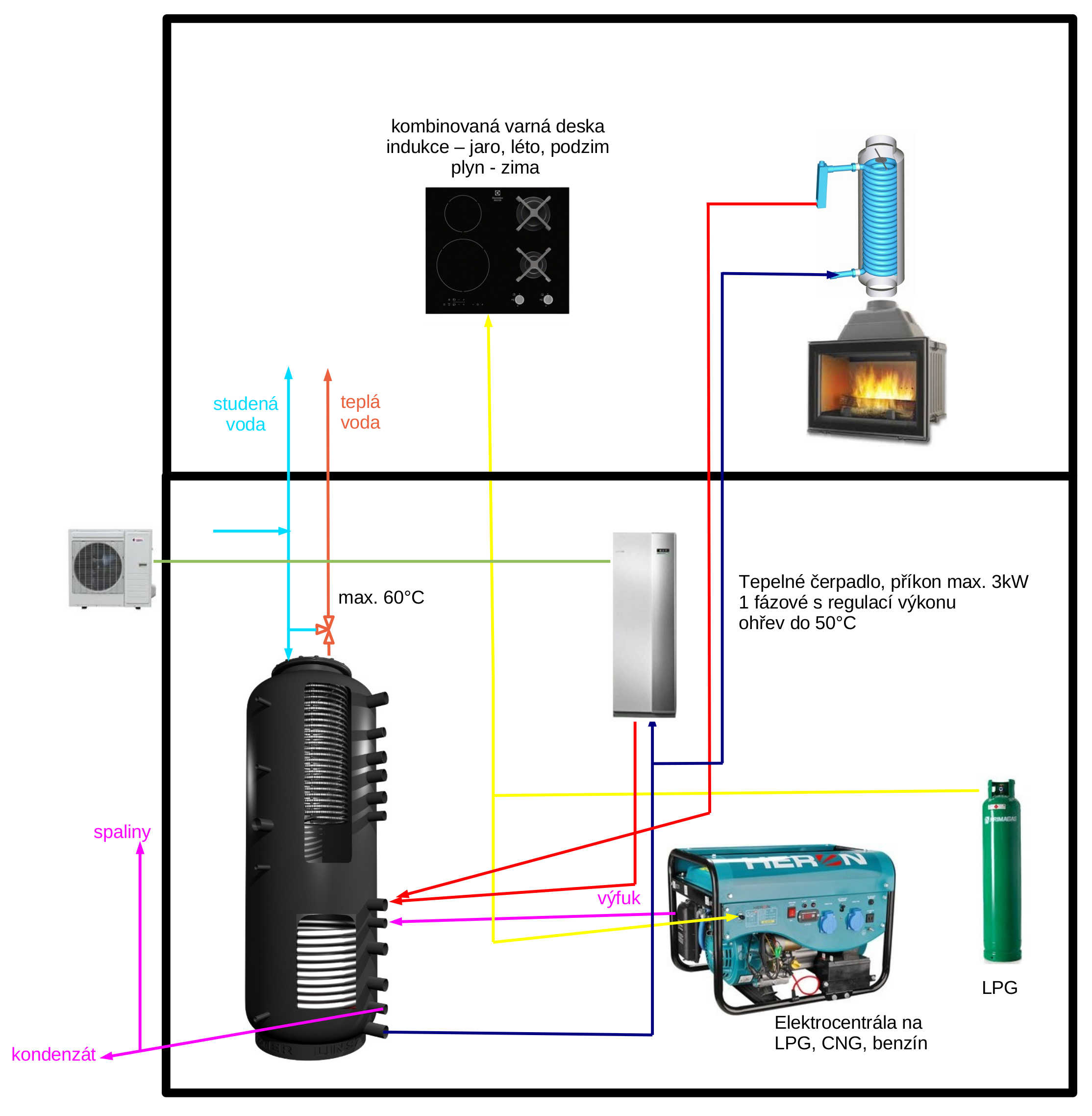 Tak bude nutné nainstalovat záložní zdroj elektřiny na ty dva až tři zimní měsíce. Jinak by se mohlo stát že nebude elektrická energie ani na provoz kotle a čerpadel. Bude nainstalována elektrocentrála na LPG, CNG, benzín http://www.heron-motor.cz/cs/produkty/elektrocentraly/