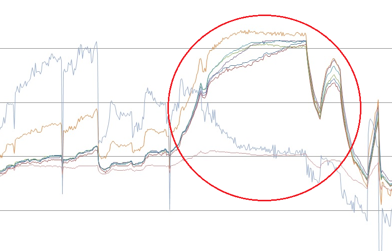 Zajímavá zkušenost ze včerejška, kterou si neumím vysvětlit. Zasvítilo - většina článků jde nahoru až k balancovacímu napětí a ten náš nemocný jde proti nim dolů, zatímco jinde v grafu kopíruje směle napětí ostatních s větším rozptylem. To mi hlava nebere. Ví někdo, čím to může být způsobeno???