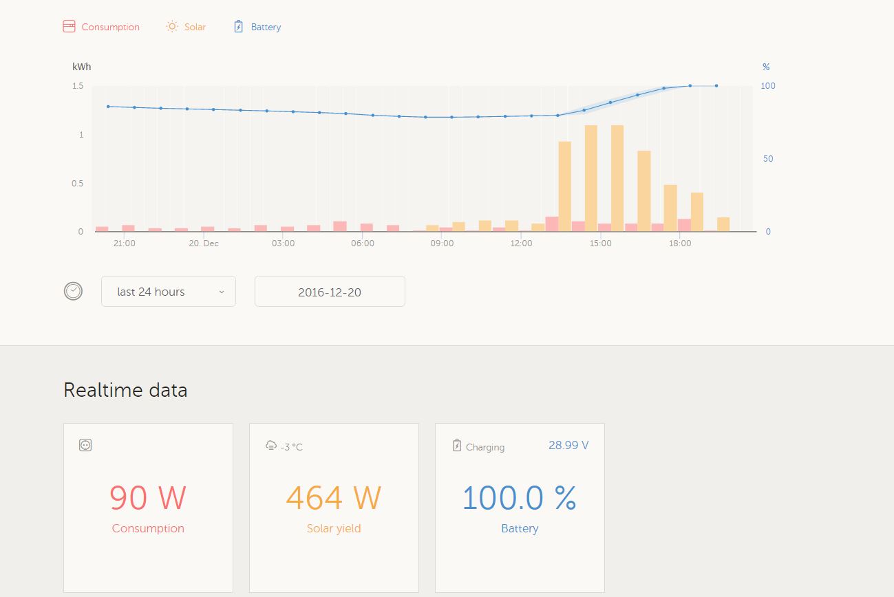 To moje dává aj kolem 46A při cca.30V a spotřeba no nevím přesně něco přes 1l za 1h. Nakonec jsem to přece jen nevydržel a mám ho připojené na regulátor Victron BlueSolar 150/70-MPPT přes přepínač 1-0-2. Buď jsou připojené solární panely nebo soustrojí. Zatím to jede bez problému regulátor si ten nabíjecí proud řídí sám, postupně ho snižuje až na FLOAD na 7A. Kolem 15x nabíjení už mám za sebou, zatím je vše v pořádku. Přikládám jak vypadají grafy dnešního nabíjení od cca.80% do 100% nabití baterii, výkon soustrojí (solárních panelů