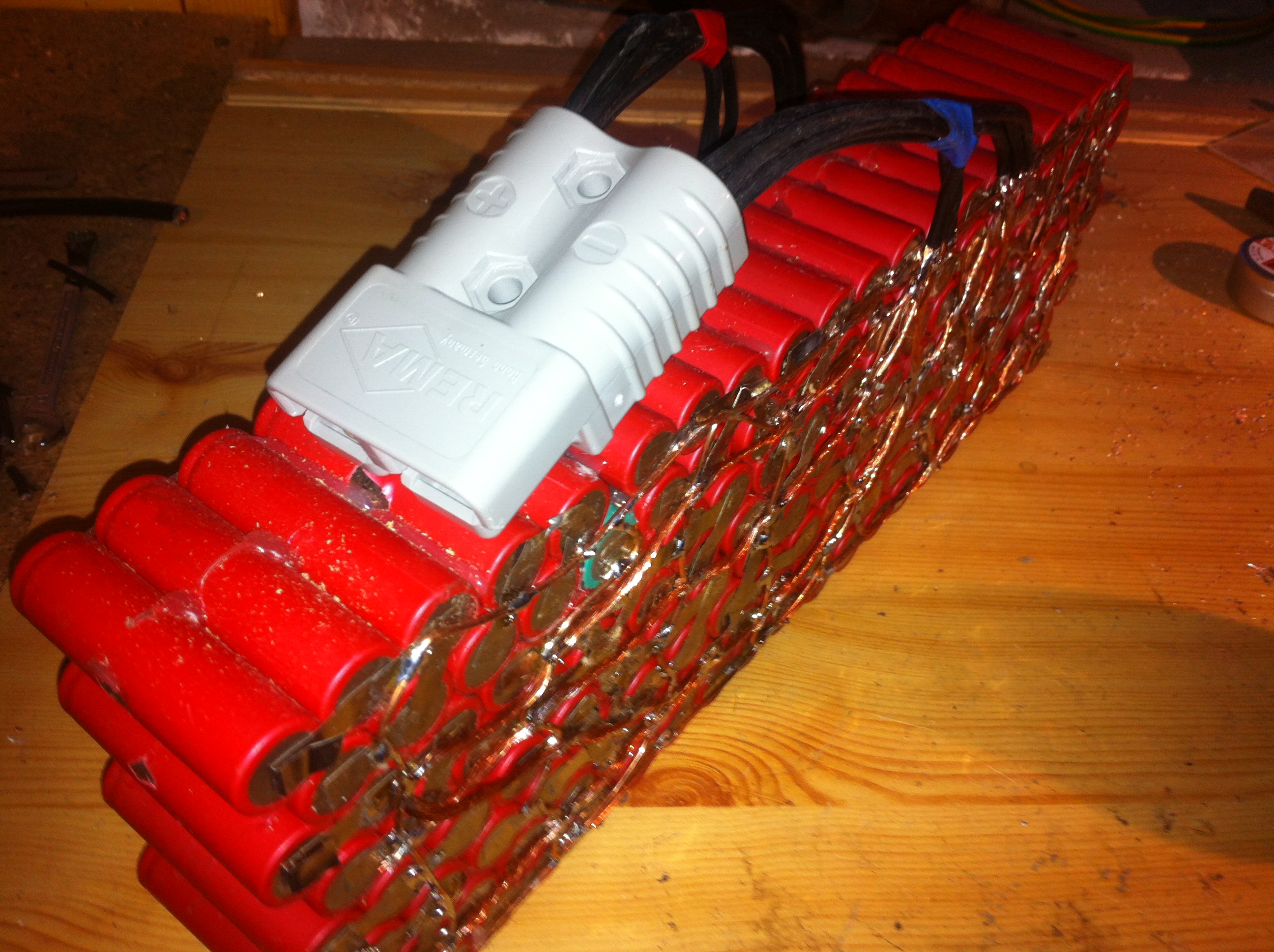 Jednotlivé "baterky" jsou propojeny 200A konektory Anderson (REMA). Původně jsem měl obavu o ztrátu na konektorech ale při běžném odběru 500W je na nich zanedbatelná ztráta 10mV.