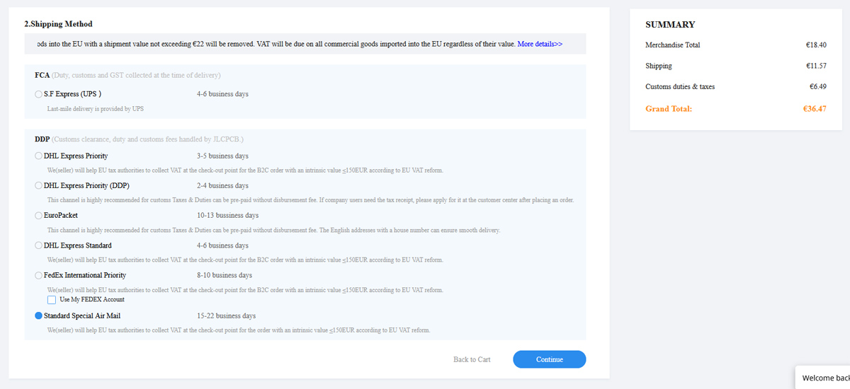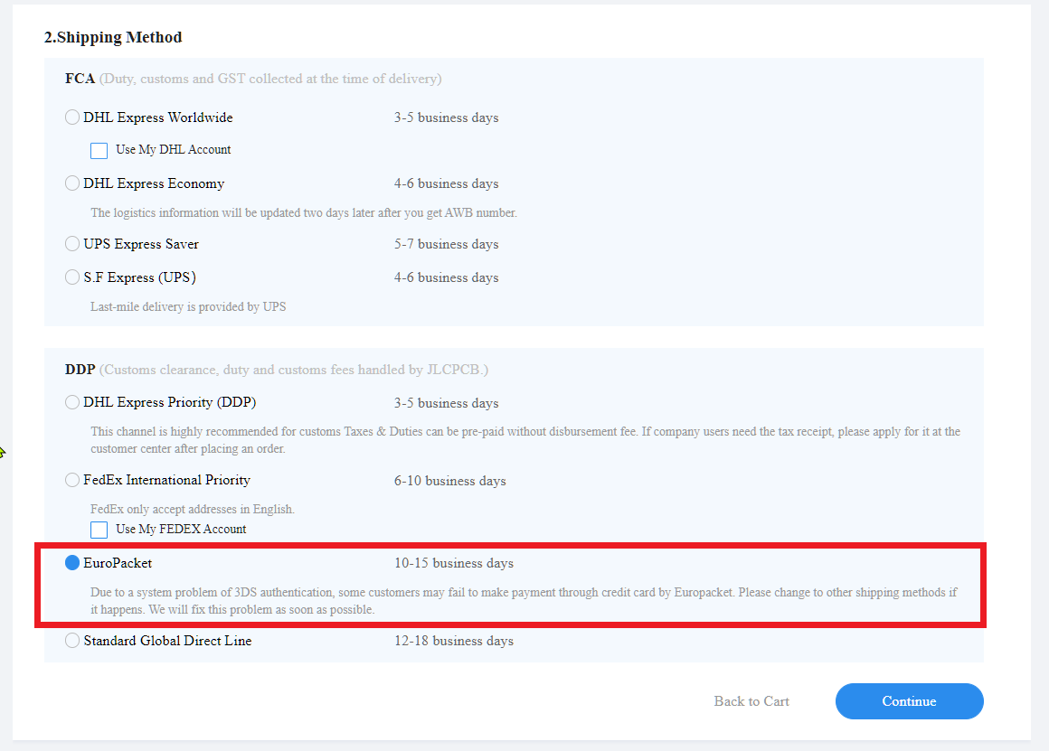 U JLCPCB jsem objednával nějaké desky 4 druhu po 5ks všechno do 100x100mm a DPS stály 14$, doprava euro packet 10$ a daň 4,88$. Býval AirMail doprava tam je, jen to je trošku jinač nazvané, ale je dražší než europacket. Cenu dopravy hodně ovlivňuje váha DPS.