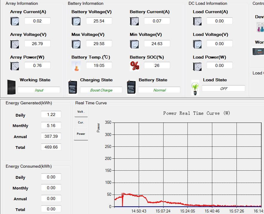 Jinak když se na ta čísla podíváte, tak zjistíte že nesedí. Výkon panelů 0.76W, napětí a proud na panelech 26.79V x 0.02A = 0.54W, napětí a proud baterie 25.54V x 0.07A = 1.79W. Je to pozorovatelné právě při takovýchto výkonech.