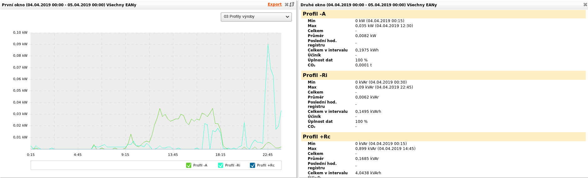 Toto zaznamenává 4Q elektroměr distributora u elektrárny s Infinisolarem se zakázanou dodávkou do sítě a fázovou regulací přebytků. Je to z distribučního portálu https://dip.cezdistribuce.cz kam elektroměr posílá data a jsou to 15 minutové průměry.