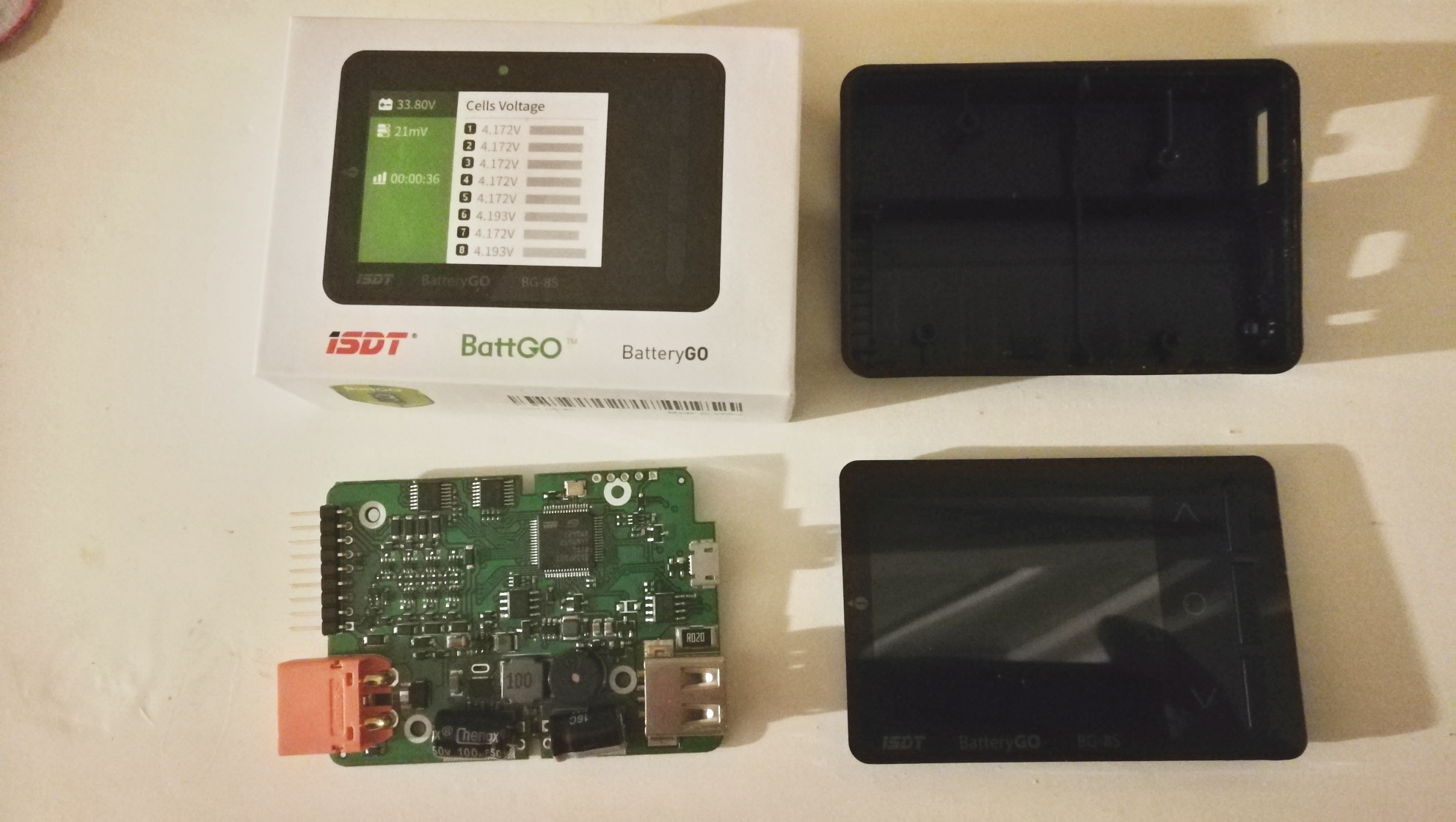 Hlídá to POD-pětí i PŘE-pětí jednotlivých článků, neumí to celkovou sadu, ani rozdíl mezi články. Aktuálně dodaný firmware je V2.5, ale nepřišel jsem na nějaký zásadní rozdíl. Nemá to žádnou formu logování, ale ten výstup na LED, sirénku i otevřený kolektor ANO. Zajímavostí může být, že spotřeba zařízení je tažena z článku č.3. Všechny ostatní mají spotřebu při měření 0,3 mA. Třetí článek má zbytek 18,2 mA. Osvětlení se vypne do nuly - CellLog ma trvale mírné podsvícení. A i když je BS12 osvětlení vypnuté, má o něco větší spotřebu. Ale v tomto rozsahu mA to asi moc zásadní není. Opět se jedná o zařízení určené pro drony - typicky to měří 2x6 článků. A to jak nezávislé, tak sériové nebo paralelní. Tedy v mém případě 8S článků to bude mírně nevyužité... Faktem je, že zařízení je v podstatě plošný spoj ve smrštitelné folii. Z plošňáku je zřejmé, že zařízení je koncipováno do instalace v nějaké krabičce, má to i montážní otvory. Takto je to funkční, nicméně dost náchylné. Což potvrdila dodávka České Pošty - jedno BS12 dorazilo s rozbitým displejem. Tak uvidíme, jak dopadne reklamace do Číny.