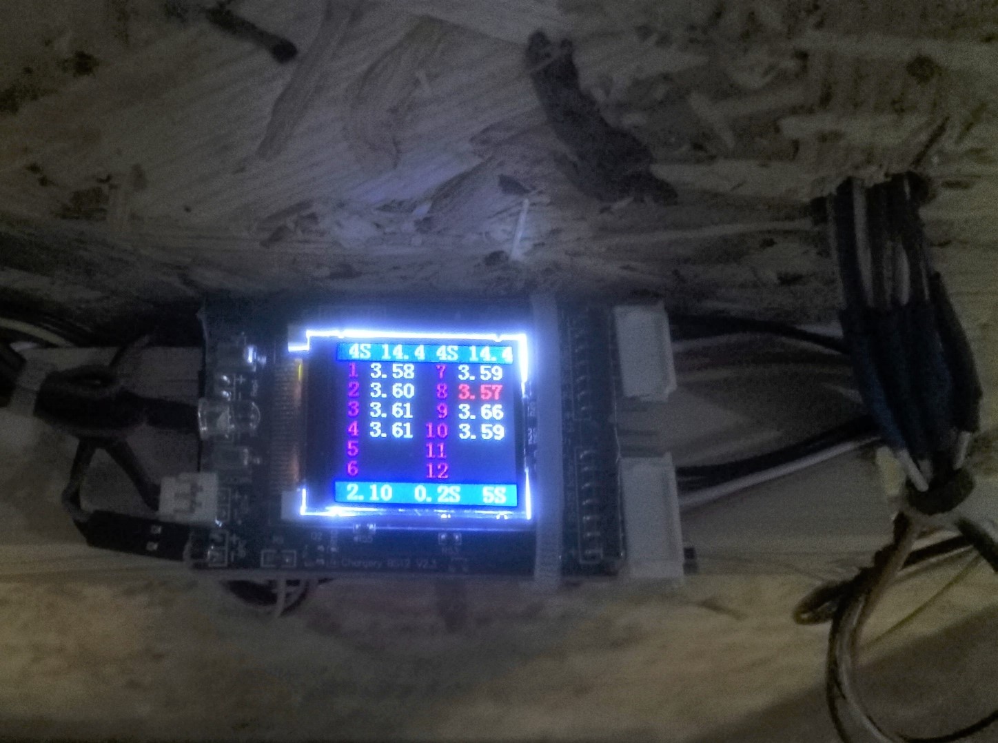 Monitoring měří dvě samostatné sady, nicméně hlášení má pouze jedno. Horní řada 4S počet článků, 14,4 jejich celkové napětí. Spodní řada nastavení min. napětí článku (to jsem už zvýšil...), prodleva v měření a doba hlášení chyby. Článek s nejnižším napětím červeně. Výsledek jsem kontroloval přes CELLMETER 8, více méně se to potkává na tom druhém desetinném místě +-1 až 2 digity. Doba svícení je nastavitelná od 1 minuty do trvale.