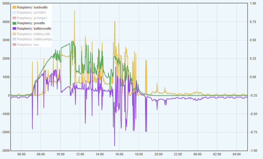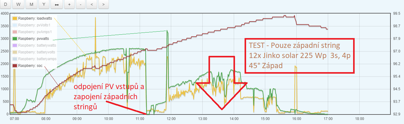 I když hodnoty níže uvedené jsou se vzorkováním 10s na serveru, a nějaké hodnoty špičkových hodnot nejsou zobrazeny tak Vás všechny ujištuji že test proběhl úspěšně. ani jeden výpadek, ani náznak divného chování... max výkon zaznamenaný v denních maximech byl 5,8 kW a to při současném používání myčky, protože rodina si servítky nebere.