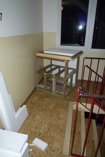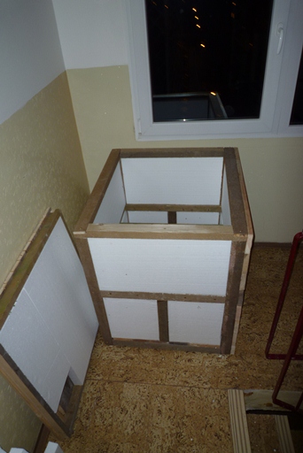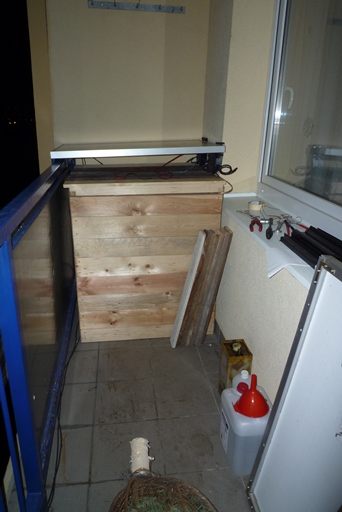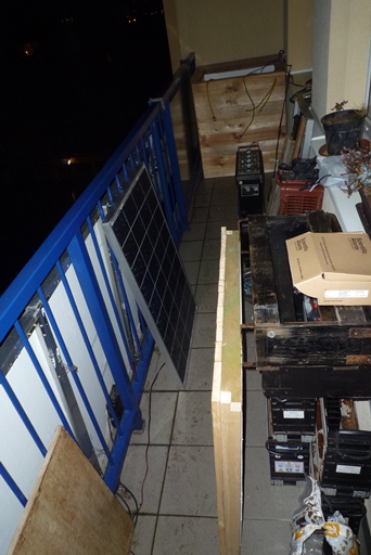 1. dřevěný box na baterky vejde se do něj 60článků (6sad) NiCd mix 160 a 100Ah. Baterky jsou ve dvou patrech, každé má nosnost cca 270Kg. Celá bedna je izolována 5cm polystyrenem a v zimě je vytápěna. tím jsem docílil že v ní neklesne teplota pod 10°C. A takhle vypadá na balkoně, střechu tvoří fve panel, který bude více našikmo. Pohled do bedny, spodní patro je již plné a nahoře je pouze jedna sada. No a takto vypadá balkon když je něco rozděláno:-)