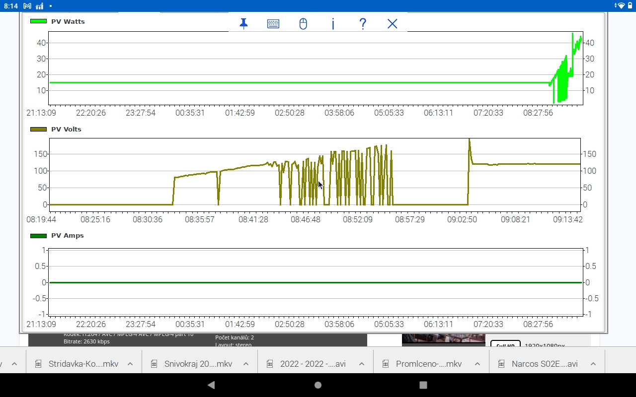 Na prázdno mají rozpojené stringy podobné napětí (cca 118V), při zátěži ze všech stringů teče téměř stejný proud. Mezi panely a regulátorem je asi 40 m kabelu cyky 5*10mm v zemi, v tom by snad také neměl být problém. Při odpojení a opětovném připojení panelů regulátor postupně snižuje napětí až skončí na oněch 60 V. Při silnějším osvětlení se zdá, že se chová standardně. Vedle umístěný Fangpusun (victron) udržuje napětí podstatně víš, nicméně má jiné panely, které mají jinou orientaci.